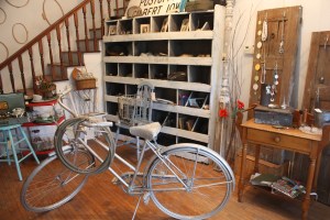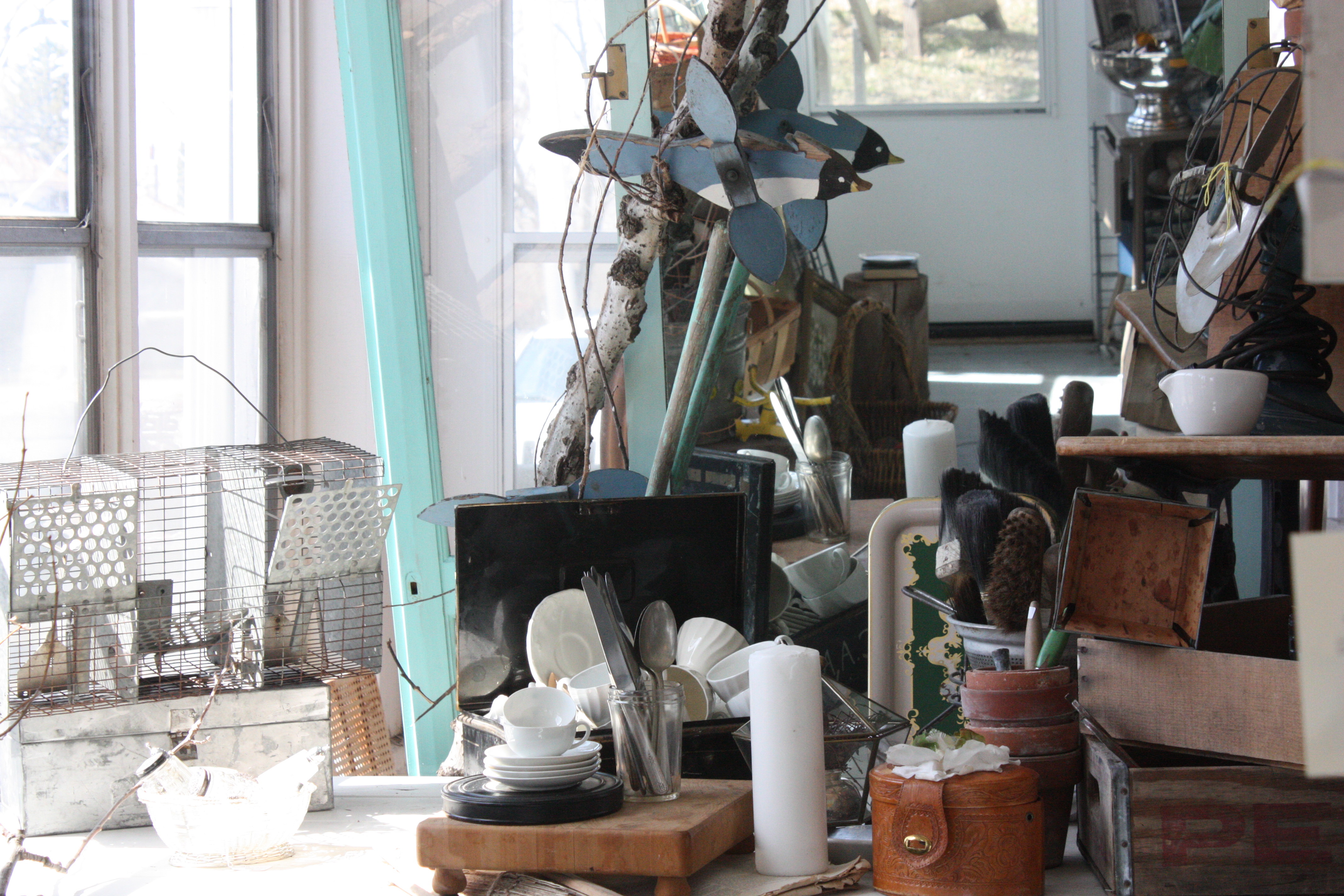 JB Knacker opened its doors in November of 2005 after four successful years as an occasional sale. The shop now keeps regular hours on Tuesday through Friday from 1-6 p.m. and Saturday from 10 a.m. to 3 p.m. The shop is in a 130-year-old two-story building, and on this particular day I found it overflowing with goodies: antique furniture, glassware, homemade soaps, vintage photographs, old spectacles, pillows, dresses, an antique high chair, bicycles, jars, windows, jewelry, gardening supplies, vintage signs, dishes, baby shoes, a bowl full of silver cups, cameras, and much, much more.