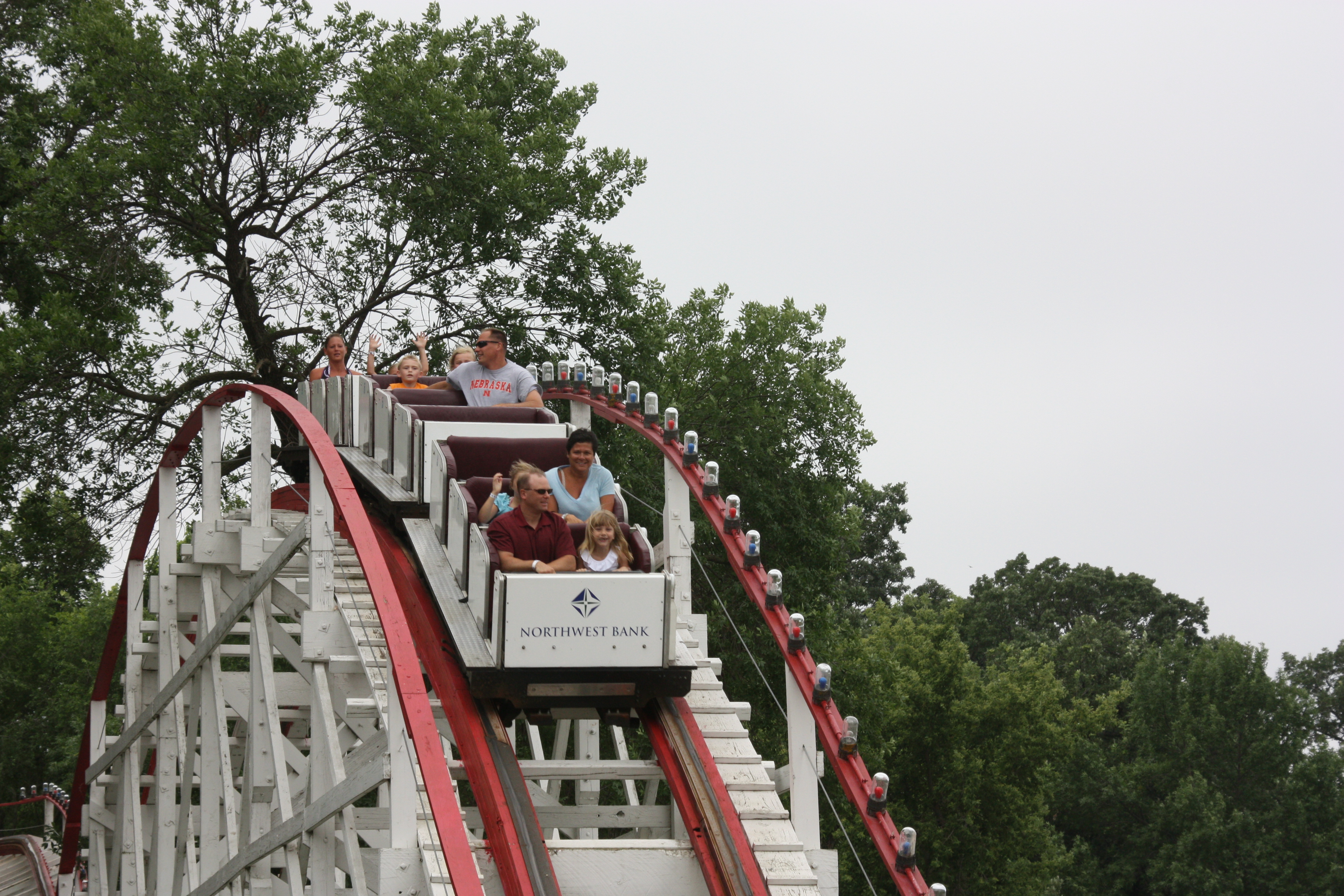 I was there when it opened this morning (11 a.m.) and stood in a line to buy a ticket to ride the roller coaster (its unfortunate official name is the Northwest Bank Legend Roller Coaster). The park has way too many ticket choices (single day passes, ankle bands for toddlers, meal deals, family fun packs, punch cards) and I stood behind ONE family for like 20 minutes while the way-too-helpful woman in the ticket booth helped them choose their fun for the day. (Meanwhile, the other line was lapping mine.) Finally it was my turn and she sold me seven $1 tickets so I could ride the coaster.