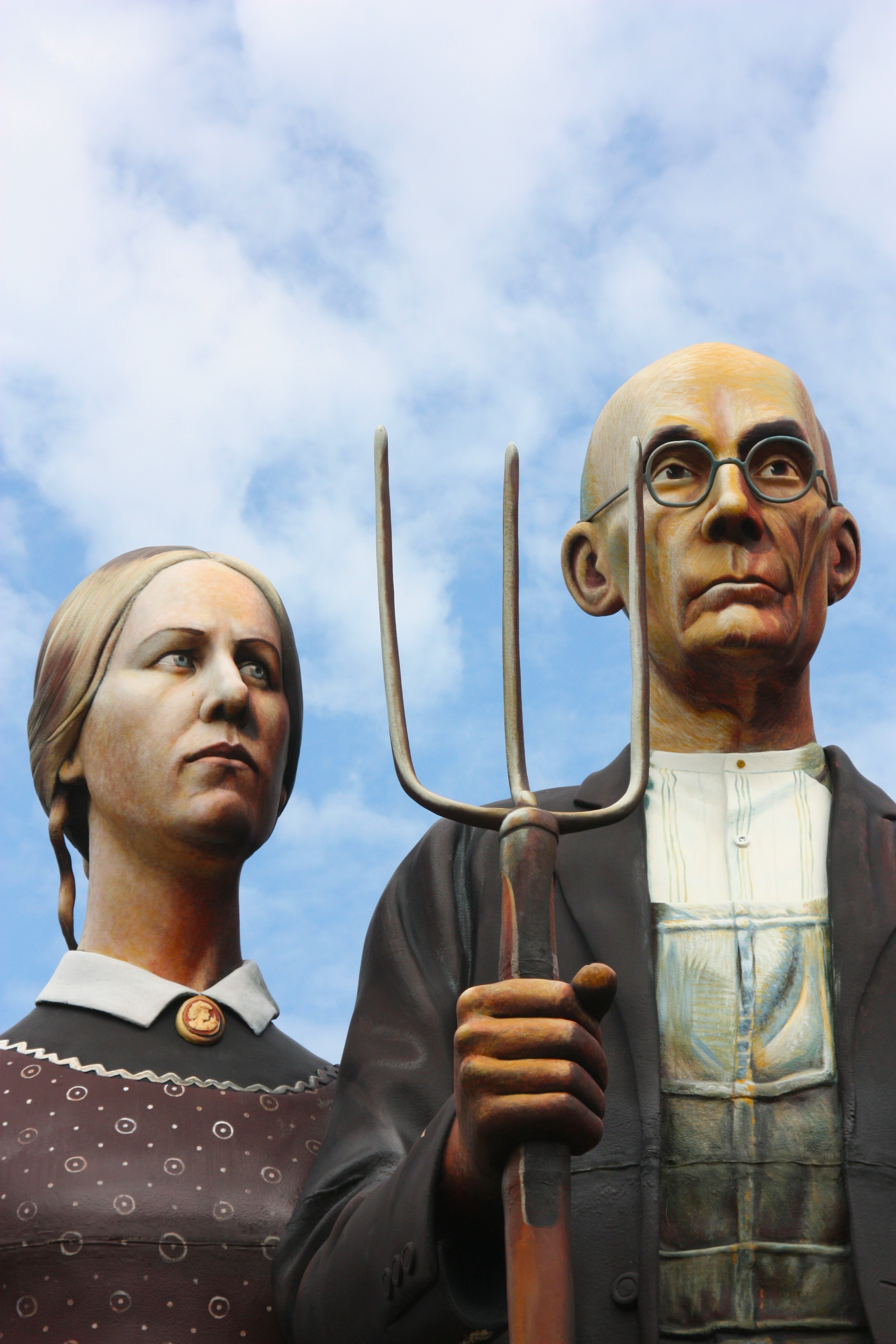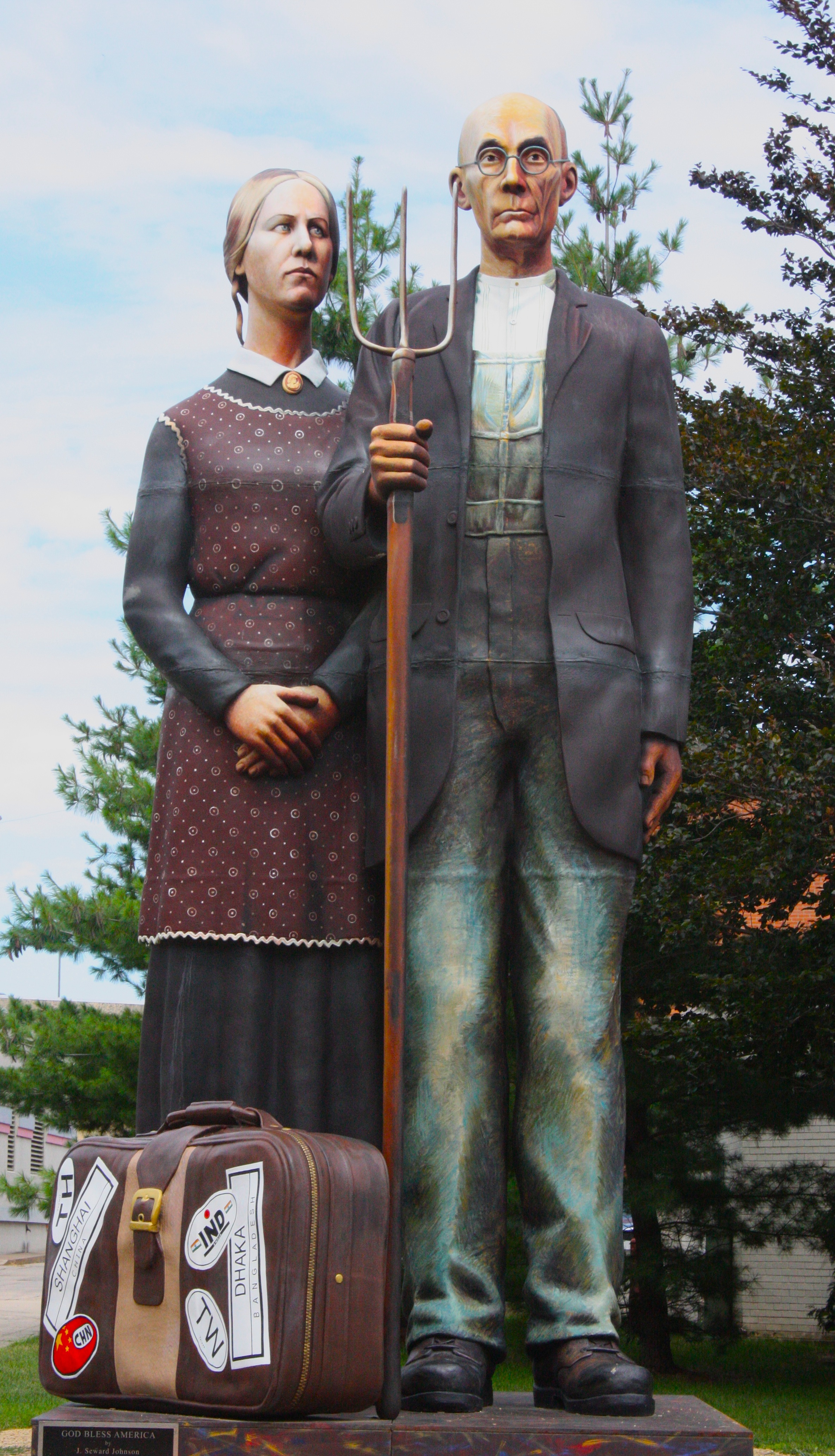 The sculpture of the iconic American Gothic painting does seem quite at home in Dubuque, but if you want to see it there, go soon. Its exhibition ends Sept. 1. Unlike many of the parodies of the famous painting, God Bless America does not attempt to satirize Wood’s art but rather enlarges and adds dimension to it. The sculpture shows the famous couple full-length with a large suitcase at their feet. I think it’s wonderful.