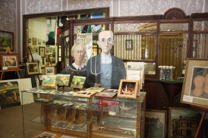 But Anamosa also turns out to be hard-core Grant Wood country, so it’s a good thing I stopped, right? I spent about half an hour in the Grant Wood “Art Gallery,” which is stuffed with weird Grant Wood memorabilia, photos, prints, knickknacks, postcards, and a gazillion framed (and unframed) American Gothic parodies. I talked to the nicest old guy in the gallery, who was very eager to help me with my quest to find more Grant Wood history in Iowa.