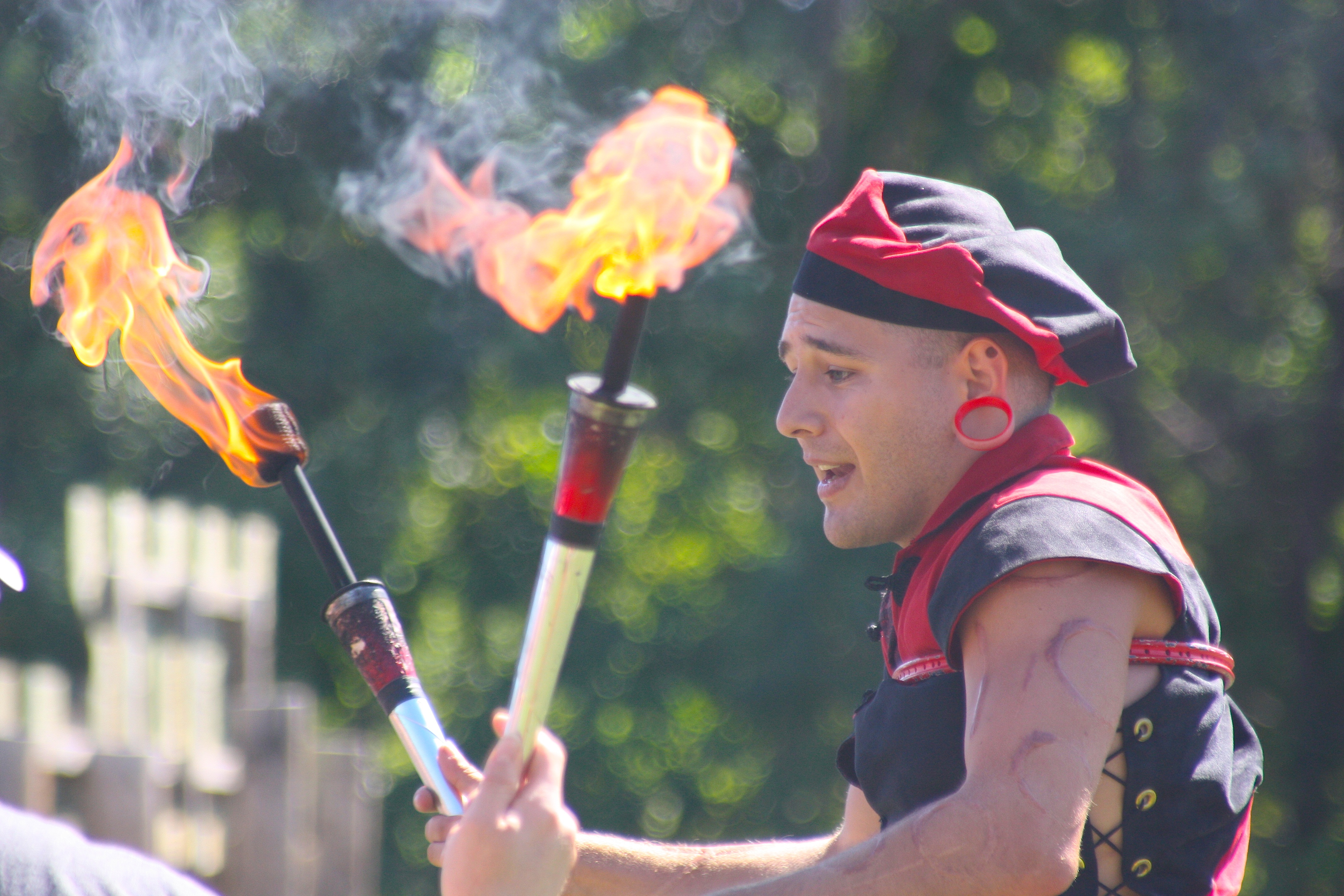 Our next stop was the South Corral Mud Yard, with entertainment by Crazy Boy Coy. Crazy Boy was a darn good juggler and put on a funny and impressive show. He seemed like a real professional, unlike those two unrehearsed dumbos in the Viking shack. Crazy Boy juggled balls and flaming sticks while balancing on a large ball, and he carried on witty banter all the while. I thought he was cute and had no problem putting money in his hat after the show.