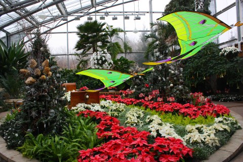 Now is a great time to see the holiday display “Snug as a Bug” in the Conservatory and shop for unique holiday gifts in the gift shop. The butterfly wing is another great place to visit during the winter because it’s toasty warm in there! The Conservatory displays change frequently. The current holiday display features oversized luna moths, orchids, poinsettias, decorated evergreens, lilies, and other spectacular blooms.