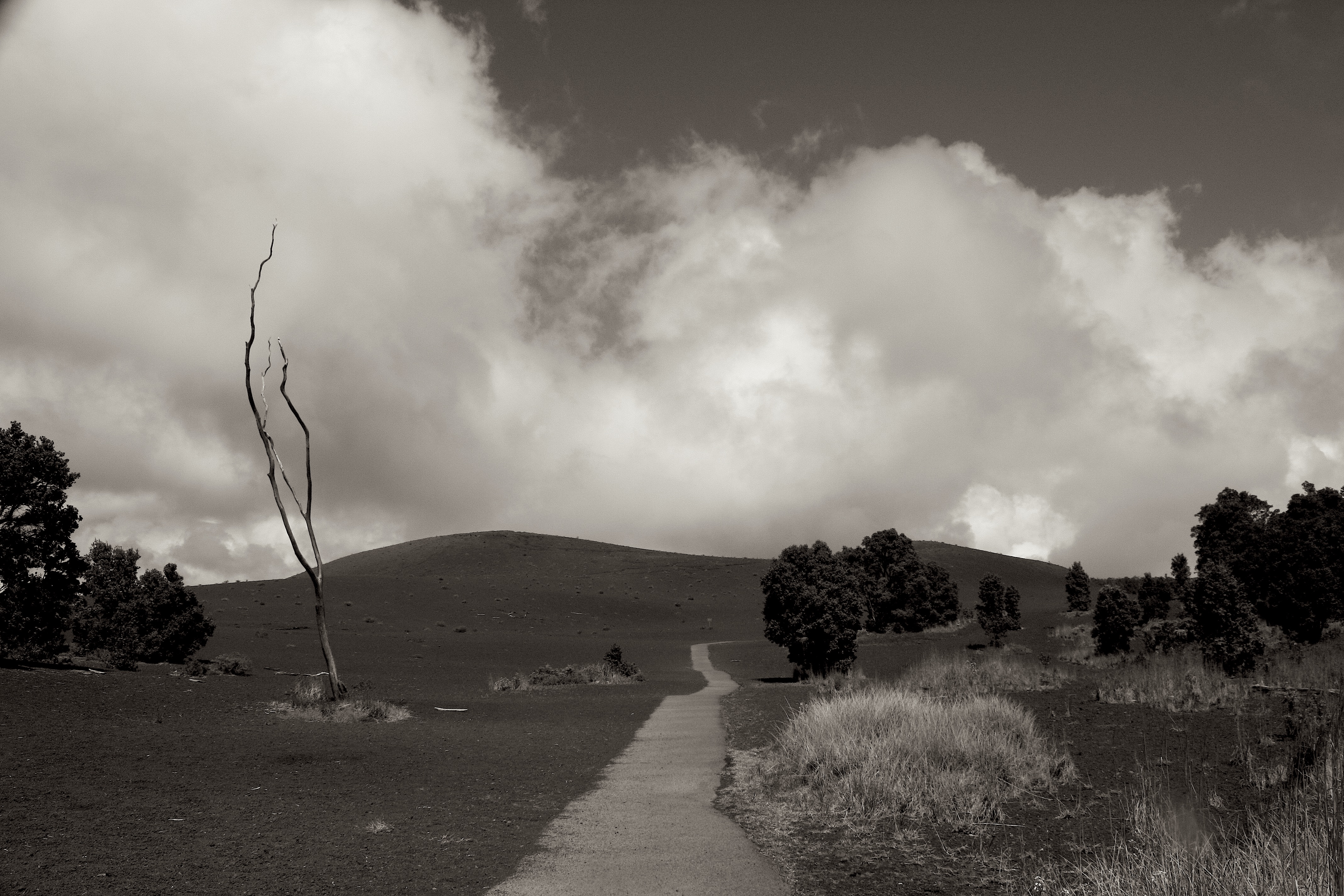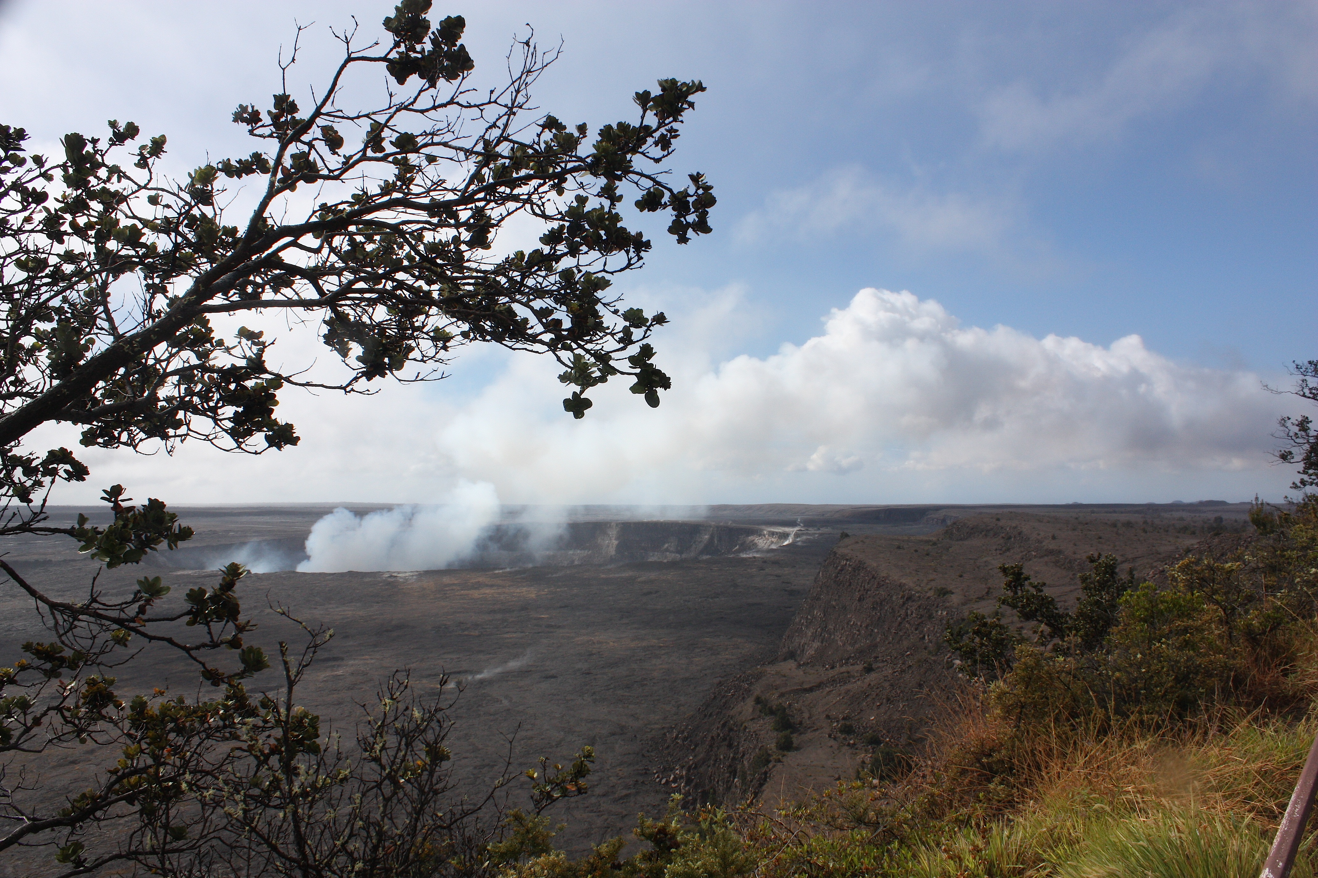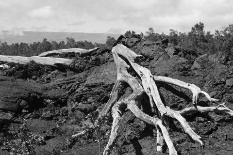 We began our tour by taking the Crater Rim Drive – at least as much of it as we could. About half of the road was closed off due to high amounts of dangerous sulfur dioxide gas. We stopped at overlooks, viewing the Kilauea Caldera from many different angles.  We hiked part of the Kiluaea Iki Crater trail, viewed steam vents (above), walked through a 500-year-old lava tube and its surrounding rain forest (stunning!), and hiked the Devastation Trail, a landscape buried by cinders from a 1959 lava fountain eruption (below).