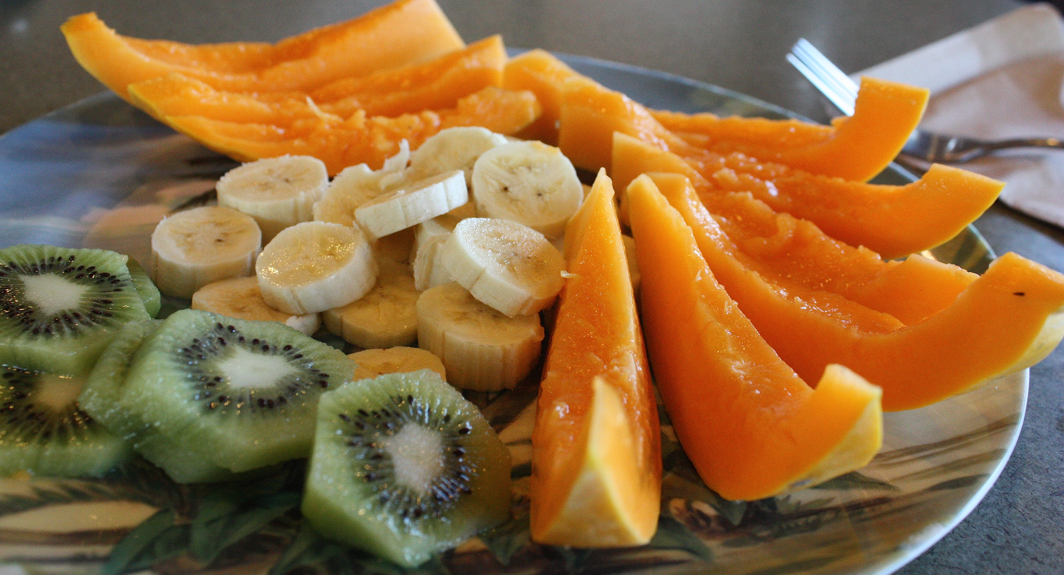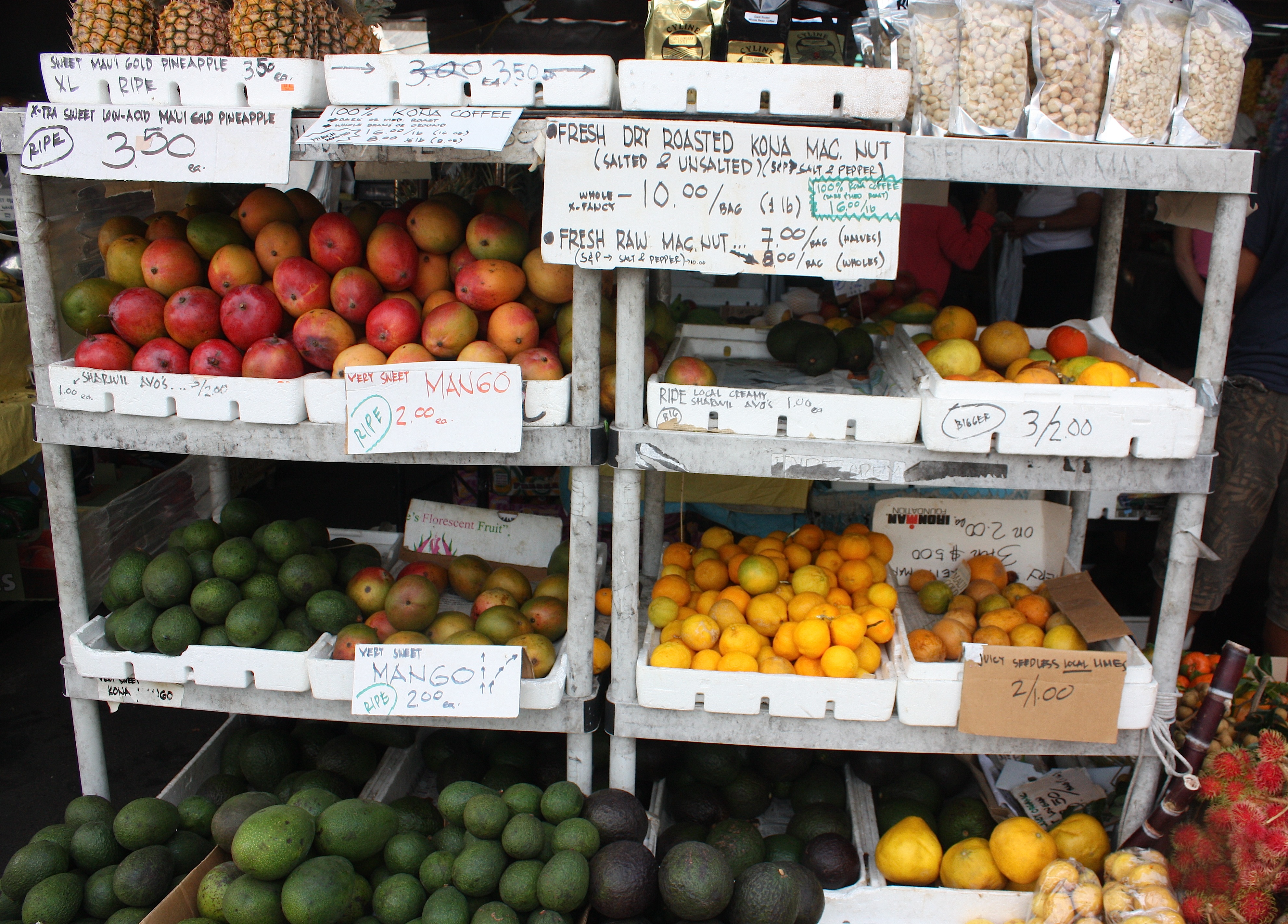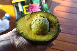 Small towns dot the highway, and we stopped both on the way (for breakfast — see my plate of fruit above — and later for the day’s provisions) and on the return drive (for ice cream and iced coffee). We passed by several stands selling local fruits and vegetables. We stopped by one not far from Kailua-Kona and bought some apple bananas, star fruit, and a gigantic avocado for breakfast the next day.