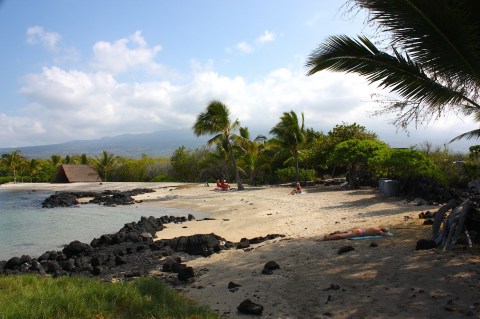On our drive back to Kona, we took the Kohala Coast highway but didn’t find it particularly beautiful. Kailua-Kona itself is a resort town, so that means lots of tourist bars with expensive drinks and very little “authentic” cuisine. We didn’t spend too much time in town. But our lodging, the Wyndham Kona Hawaiian Resort, couldn’t have been better. So much space! We had our own patio with a dining table and lounge chairs, a huge living room, kitchen with bar seating, two bedrooms, two full baths with showers, and a claw-footed bathtub with jet sprays. Heaven!