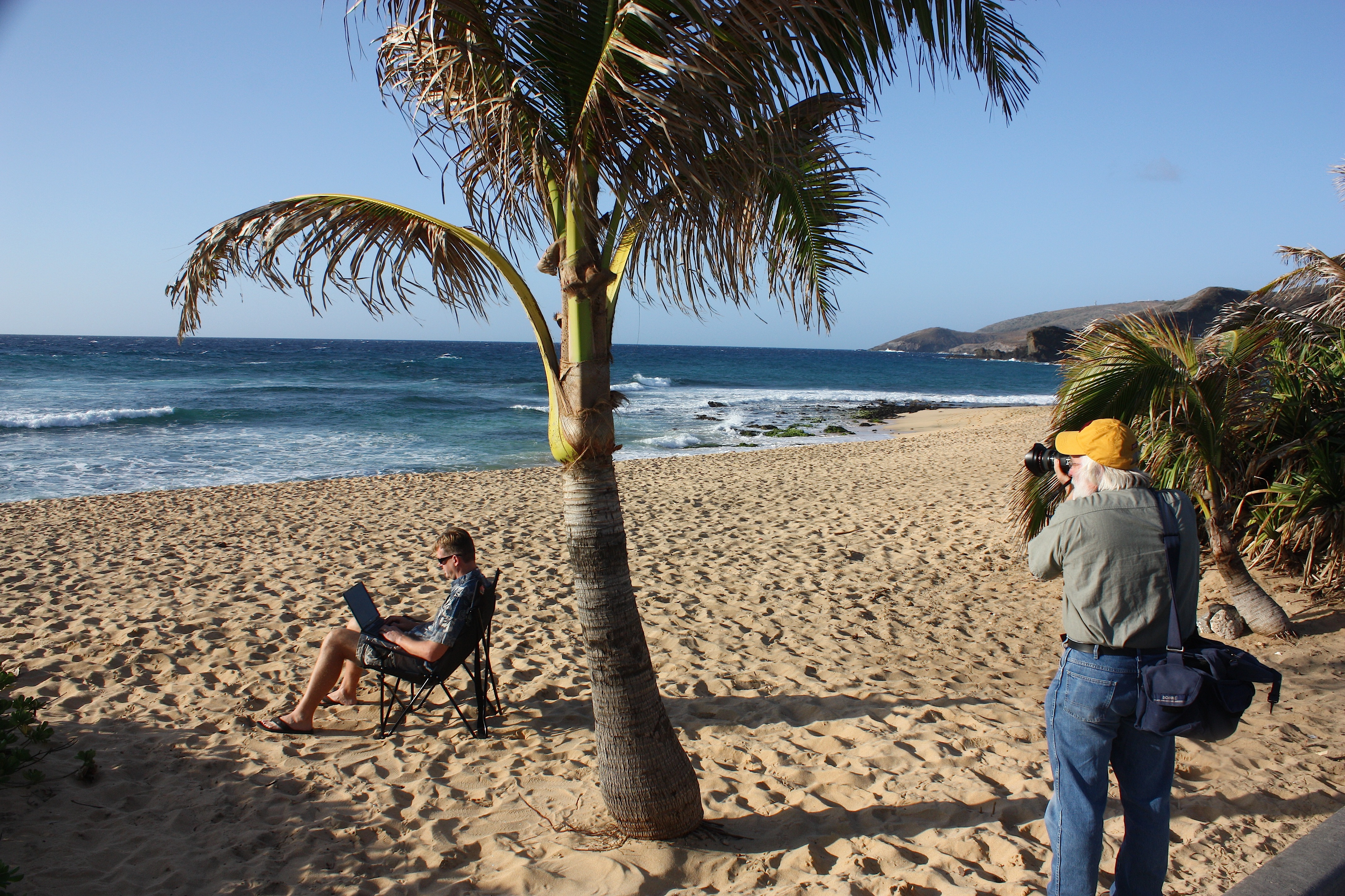 Day 3: Early the next morning we visited another Iowa State alum at his home in the Hawaii Kai area not far from Honolulu – but it seemed a world away. The homes in this area surround an ancient fishpond now formed into a tidy marina. For the photo shoot, we went to nearby Sandy Beach State Park, which seemed almost too good to be true. Only a few swimmers/surfers/sunbathers were in the area, so we mostly had the beach to ourselves. I think it was the first time I ever did a photo shoot in the sand. That’s Jim shooting Garret Pick on Sandy Beach, above.