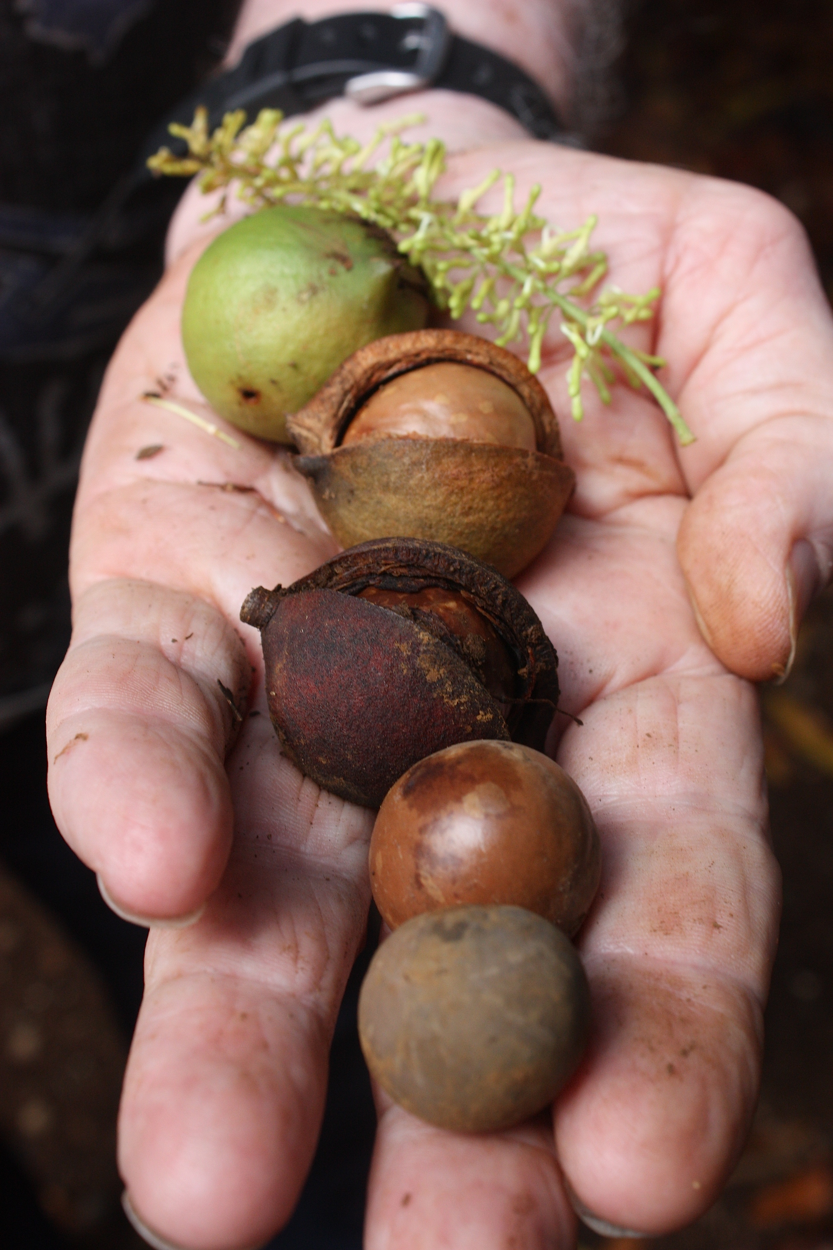 The macadamia orchard is near the town of Pepe’ekeo, and the area just steamed with humidity and green-ness. The macadamia trees are nearing the end of their growing season, but we were able to see nuts still on the trees and on the ground where they are harvested by hand.