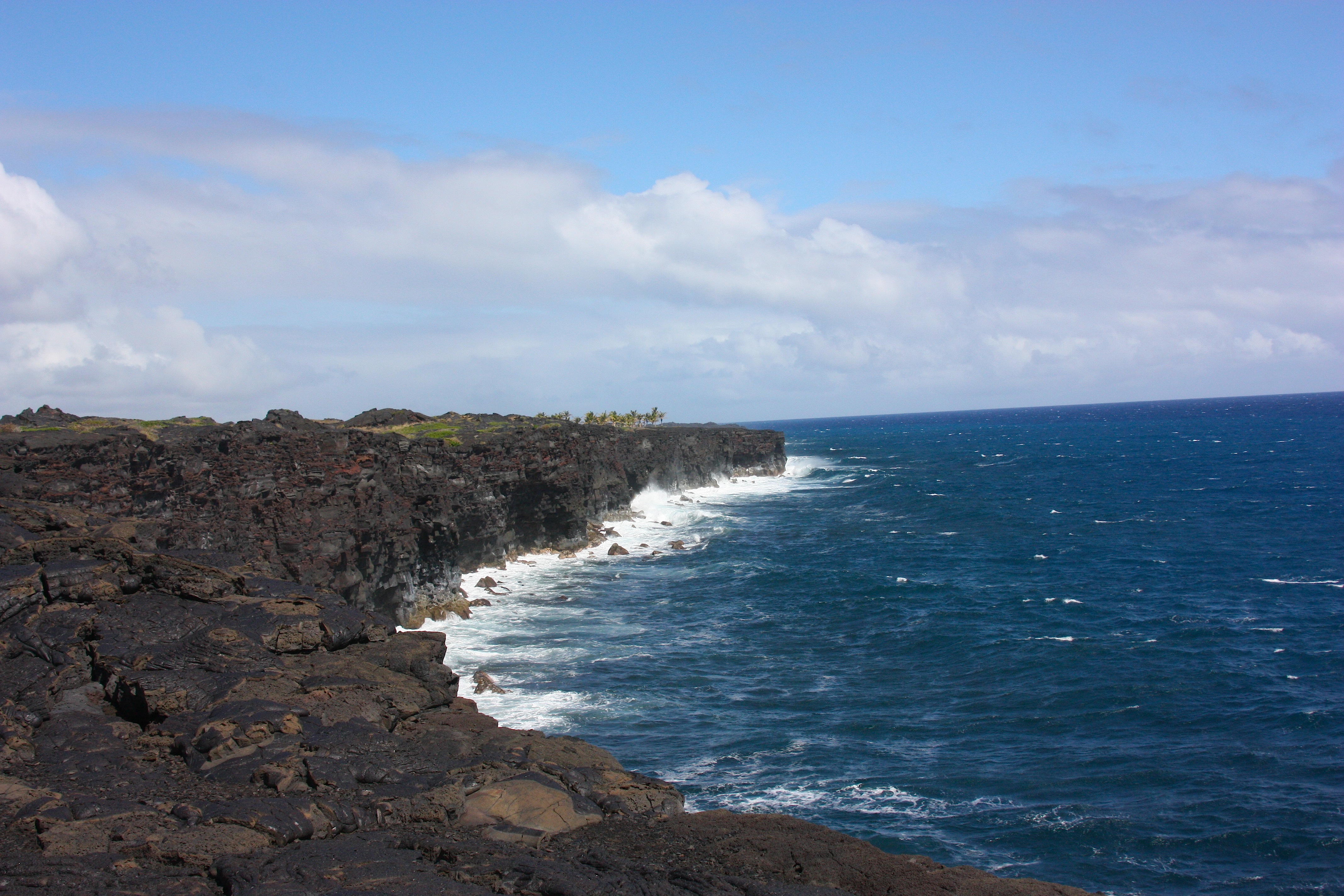 Next we took the Chain of Craters Road that leads to the sea. That’s the big payoff – the Holei Sea Arch and recent (2003) lava flows that cover the end of the road – but along the way we stopped to view a number of unique environments created by volcano activity. Much of the ground looks like the top of a pan of brownies – the cakey kind that crack on top.