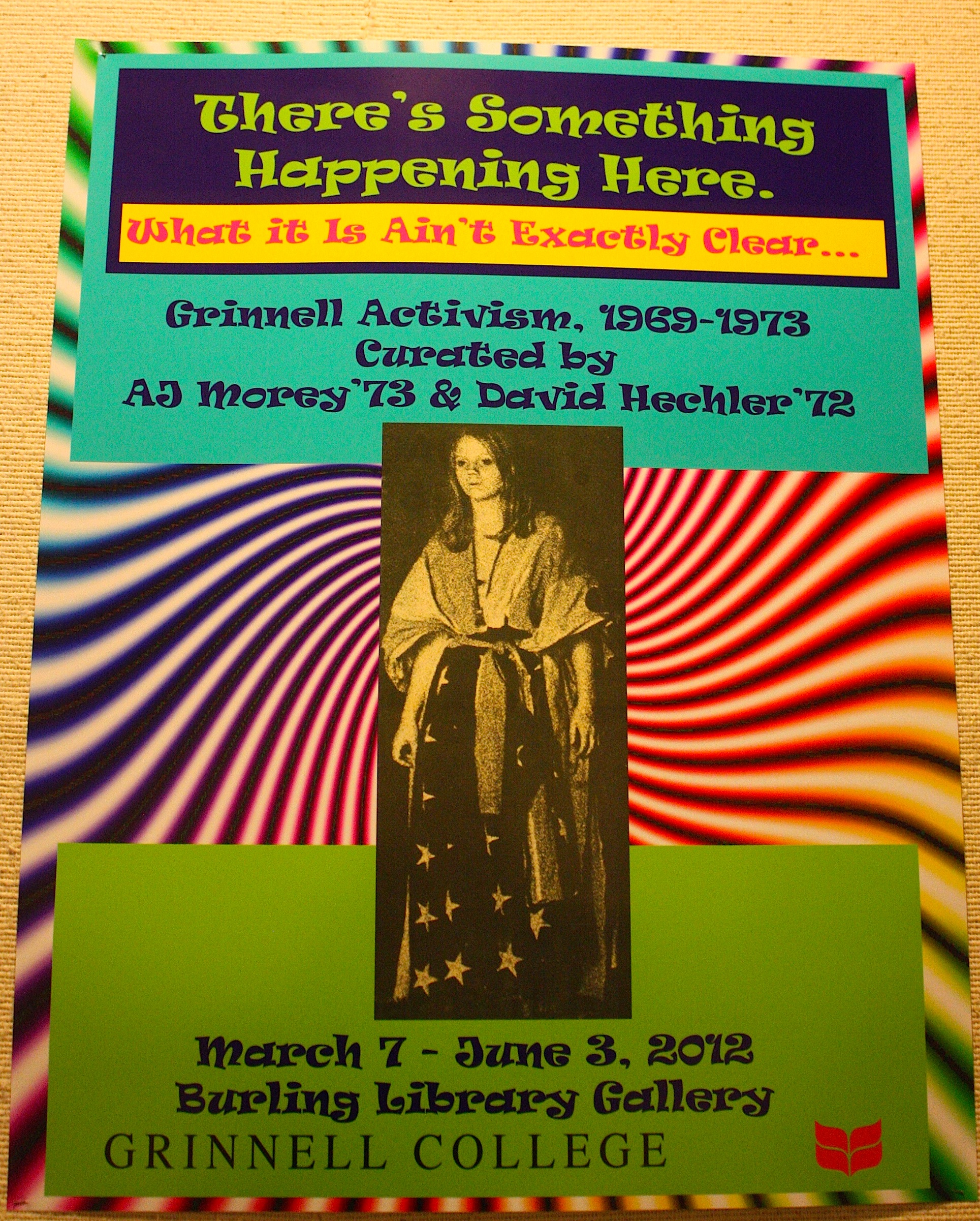 A companion exhibit is on display at the Burling Library adjacent to the Bucksbaum Center. “There’s Something Happening Here” tells the story of Grinnell’s activism from the years 1969 through 1973. The exhibit, located on the library’s lower level, contains photographs, newspaper clippings, signs, posters, artwork, and other artifacts. Don’t expect a museum-caliber exhibit from this one because it’s not. But if you’re on campus, it’s worth a stop. (Drugs! Nudity! Peace signs! What’s not to love about that?)