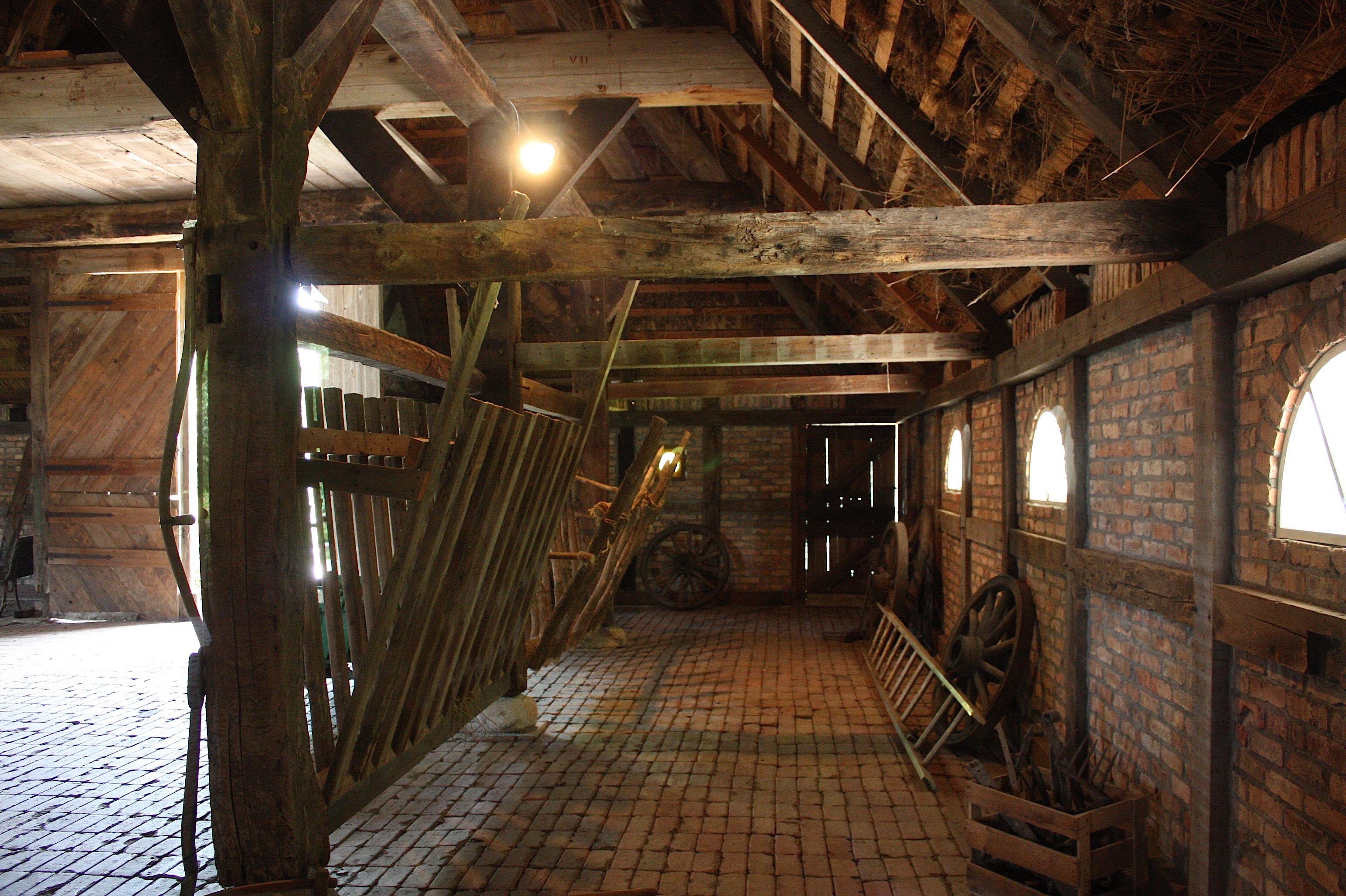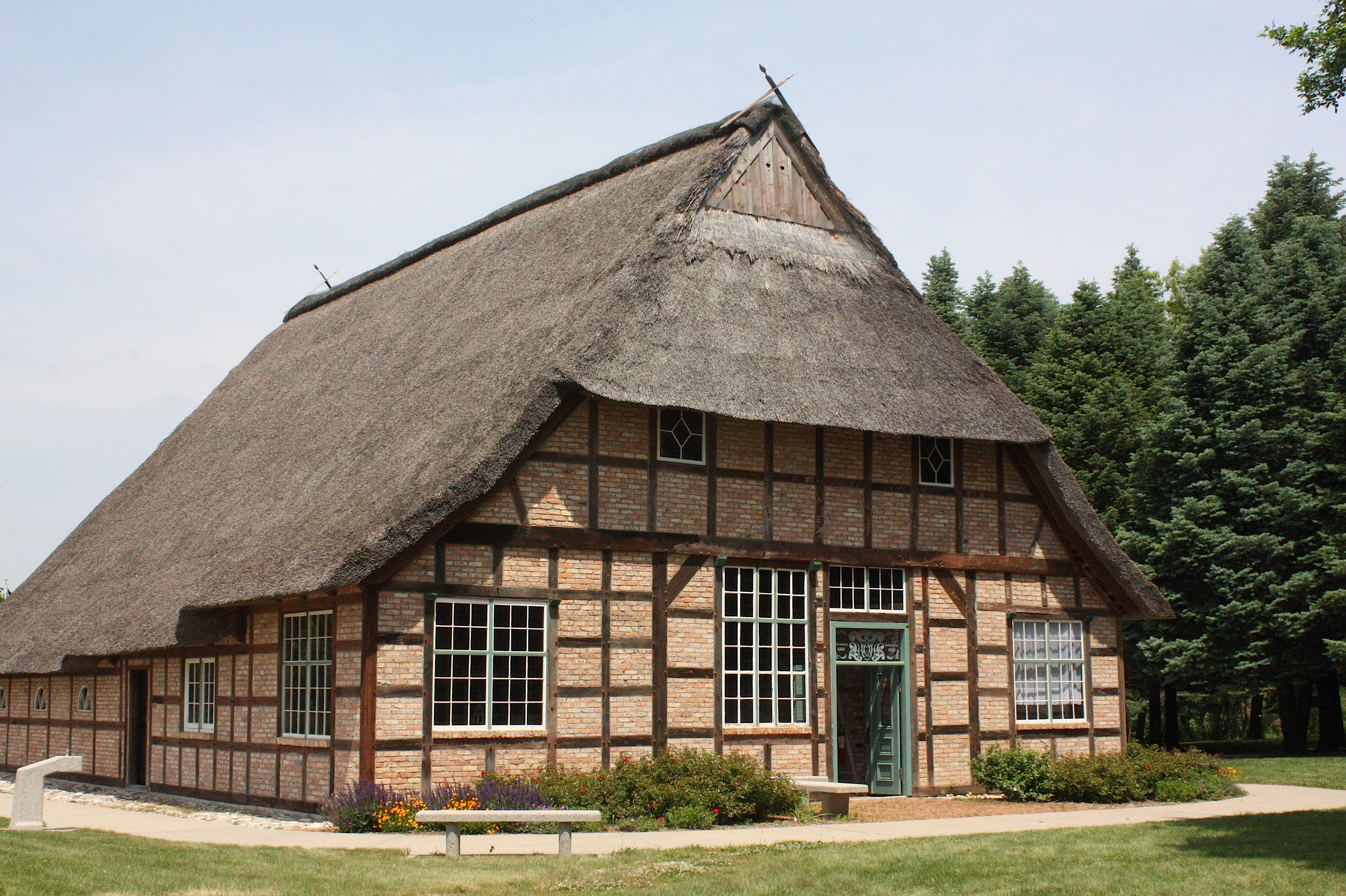 The Manning hausbarn came from northern Germany. It arrived in Manning in September 1996 to be reassembled/reconstructed with the assistance of German carpenters. (Check out the website for interesting construction details.) The building includes brick masonry outer walls, heavy timber support structures, brick interior walls, and a thatched roof. The roof is the most interesting part, given that it contains 20 tons of reeds. Three professional thatchers actually came from Germany to assemble the roof. (Who even knew there was such a thing as a professional thatcher?) All this work took several years to complete, and the hausbarn was dedicated in August 2000.