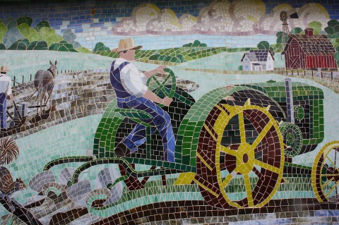 But before I left Manning altogether, I had one more stop to make. I wanted to see the John Deere mosaic created by ISU alum Clint Hansen (who also designed the mosaic mural in the ISU Alumni Center, where I work). As a traveler hurrying down Hwy. 141, it would be easy to drive right on by the John Deere dealership and think that the artwork is nothing more than a vinyl banner or painting – but don’t. Stop your car, get out, and look closely. The glass mosaic is a tremendous work of art – and I don’t give a hoot about tractors. The artwork is called “Transitions,” and its four panels tell the story of the evolution of John Deere tractors. (Again, the subject matter may not excite you, but the artistry will.)