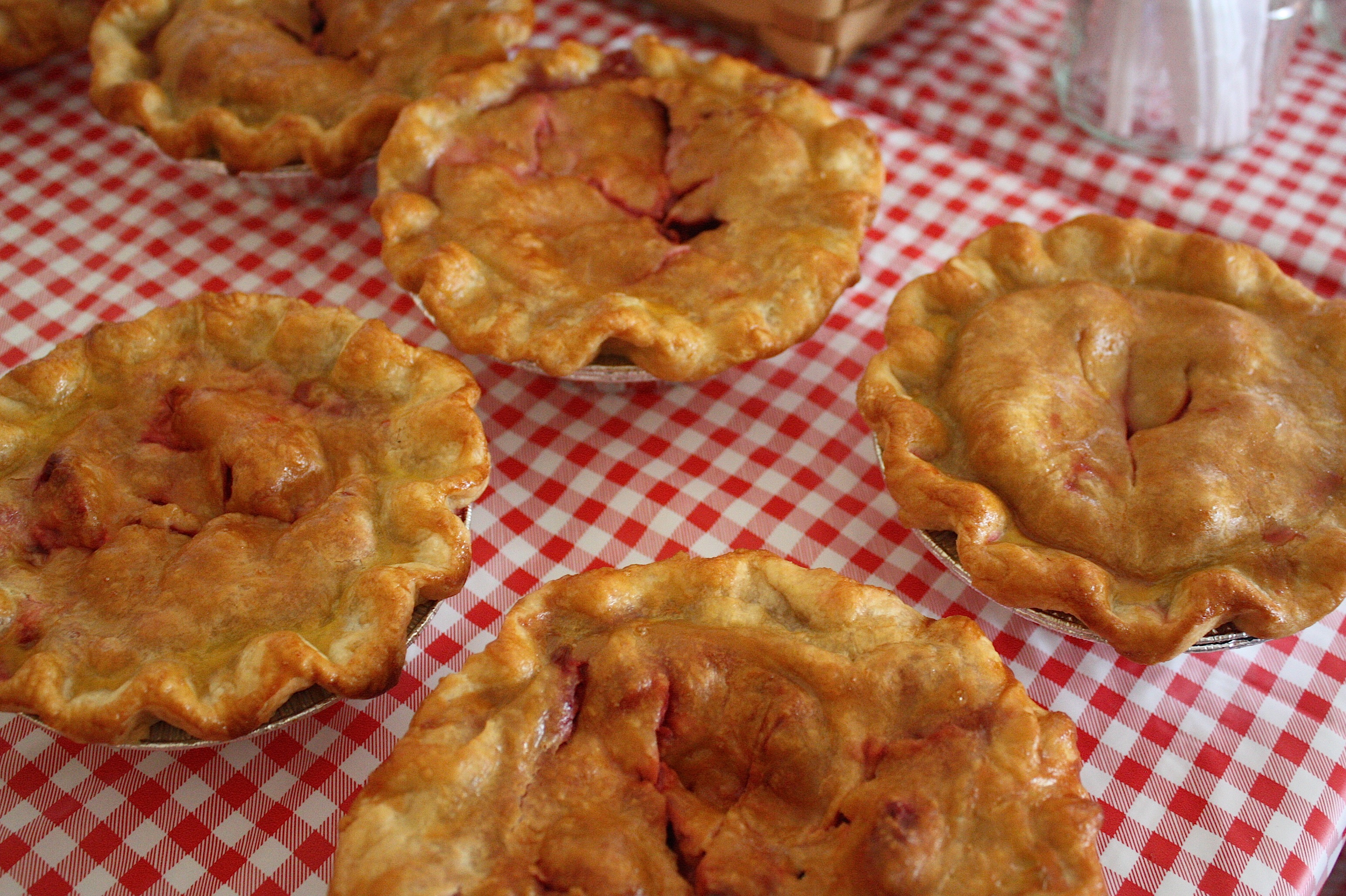 Yesterday’s flavors were apple, apple crumble, strawberry, and shaker lemon. Full pies sell for $20, mini pies are $6, and single slices are $3. The pie stand is open weekends noon to 5 p.m. through Labor Day.