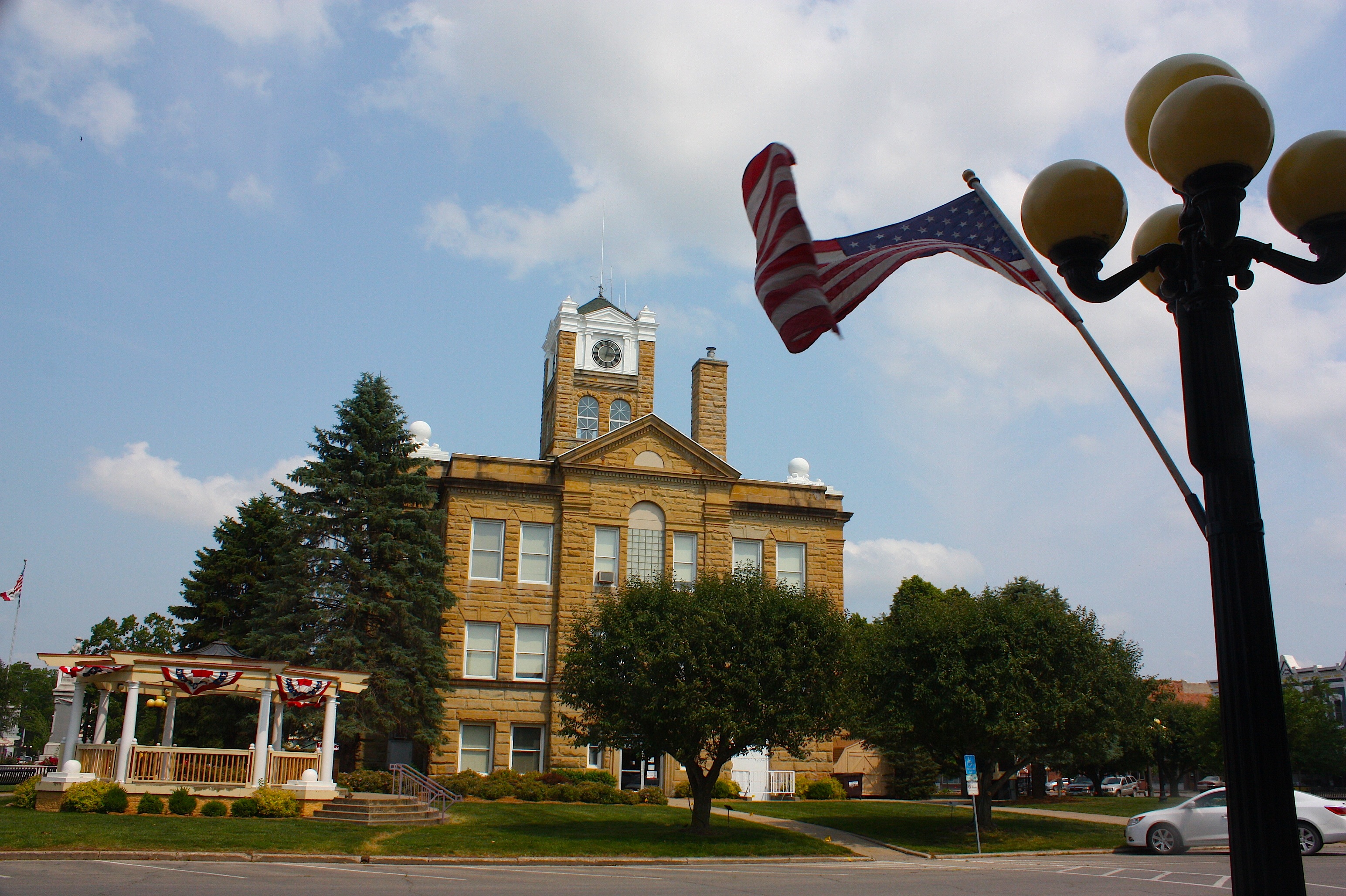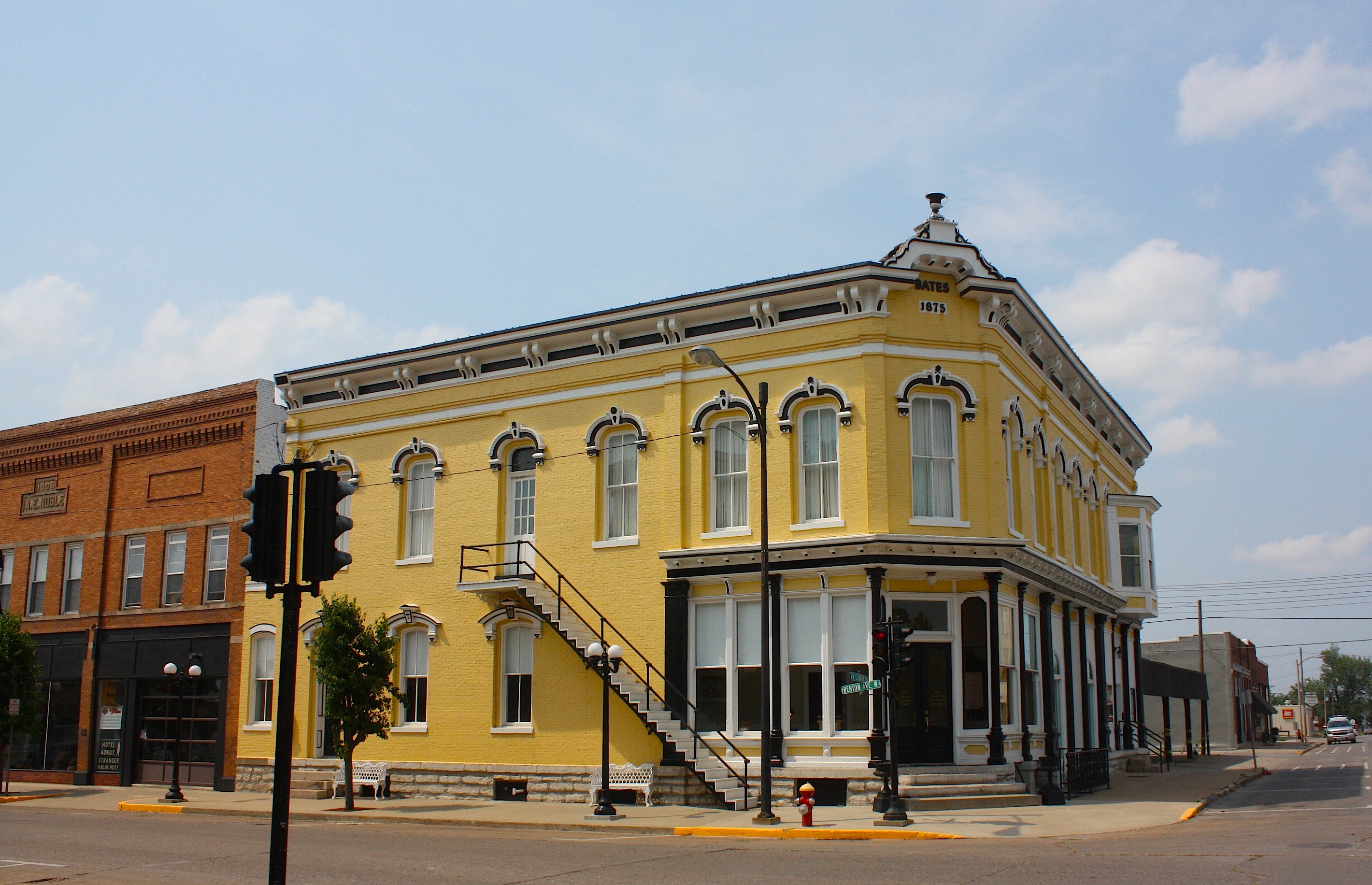 The centerpiece of the downtown square is the Monroe County courthouse; a gazebo shares the spacious lawn. Buildings surrounding the square are mostly made of brick, some with painted accent colors. Some are completely painted – for example, the R.O Cramer building, built in 1890, is blue, white, and yellow; the Bates building, built in 1875, is yellow with black and white accents. Unlike many small-town Iowa squares, these buildings are not in need of repair, paint, or new windows. Most have their names and years painted at the top; most appear to be occupied.