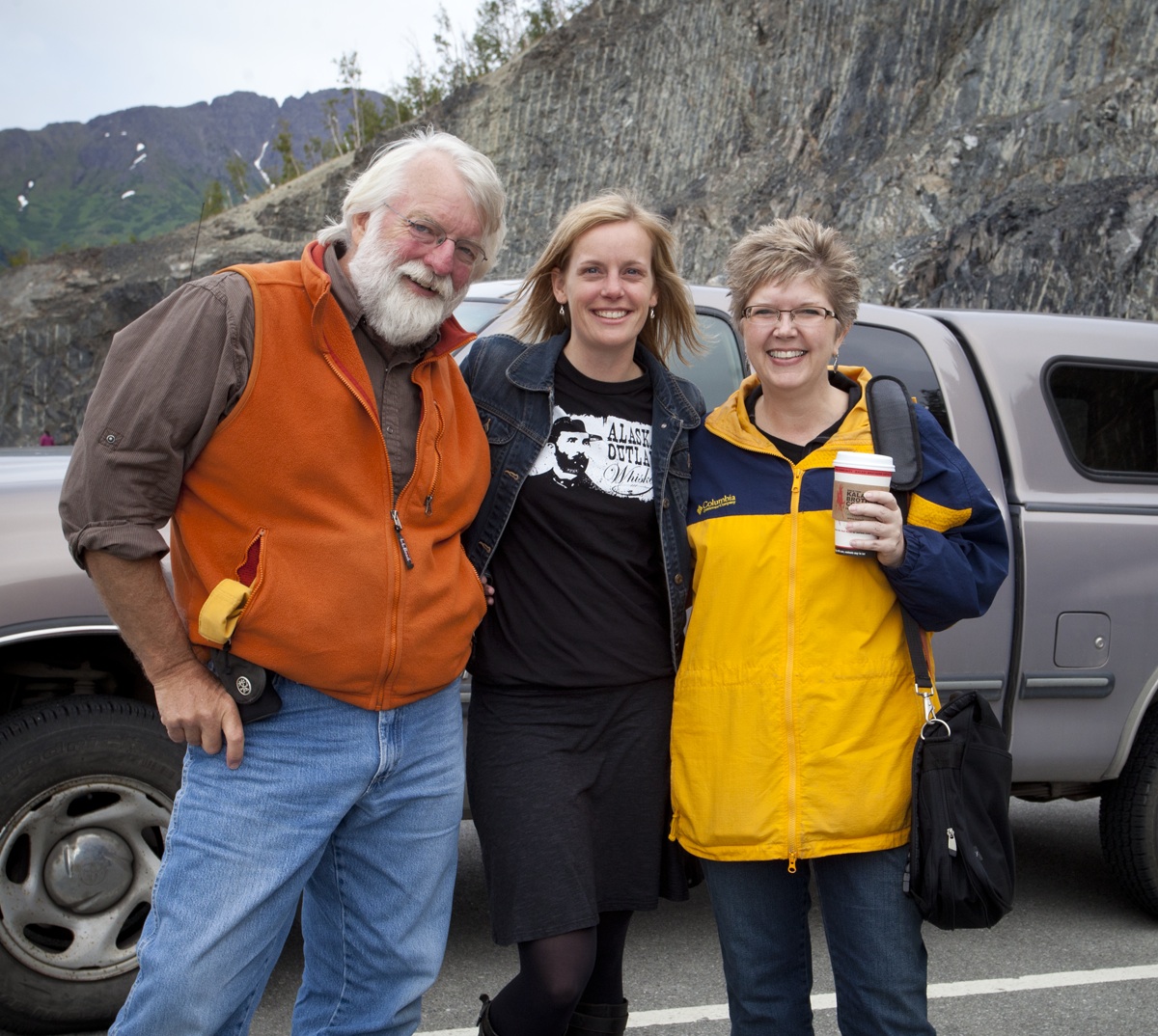 Early morning meeting with Laura Tauke, our alum for whom we’d been scouting locations. We met her at New Sagaya for coffee and then took off in both vehicles (me with Laura in her “Alaskafied” pickup, Jim in the Jeep) down Turnagain Arm. Thankfully, the weather held and we were able to photograph Laura at Bird Creek with blue skies and no wind. (When it comes to photo shoots, I am the weather fairy.) That’s Jim, Laura, and me above.