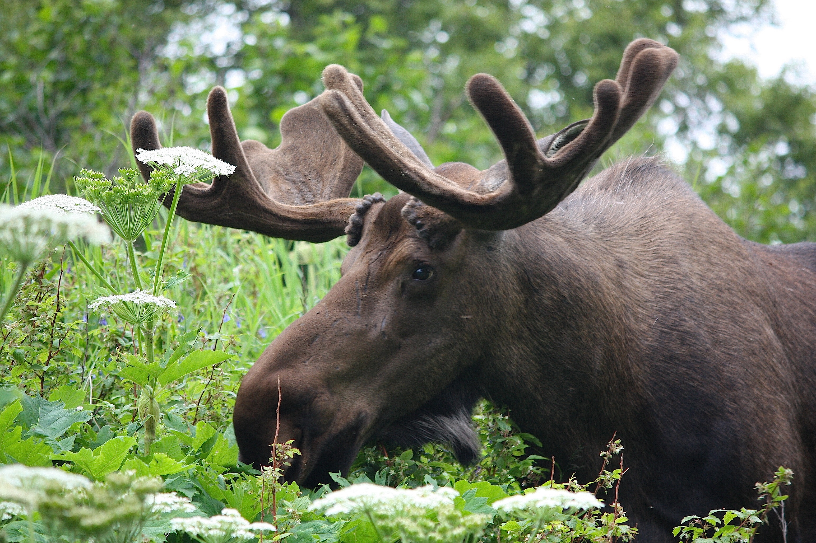 These moose did not disappoint. We had full access to the largest moose I’ve ever seen, munching away on vegetation right next to the bike path. And, as promised, a smaller guy was on the other side, trying to eat a tree. We took pictures of the big bull until we decided we might be pressing our luck being so close to him with clicking cameras, what with the death-by-moose warnings lurking in our heads. The smaller one seemed friendly, and we watched him walk unhurriedly across the path.