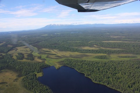 Our first view was of Knik Arm at high tide, with the towns of Palmer and Wasilla off to the right. We could see the town of Willow, the starting point for the Iditarod Trail Dog Sled Race, and the Iditarod Trail itself, which in summer is a twisty river. (In winter, Alaskans apparently use the frozen river like a highway to travel by snowmobile.)