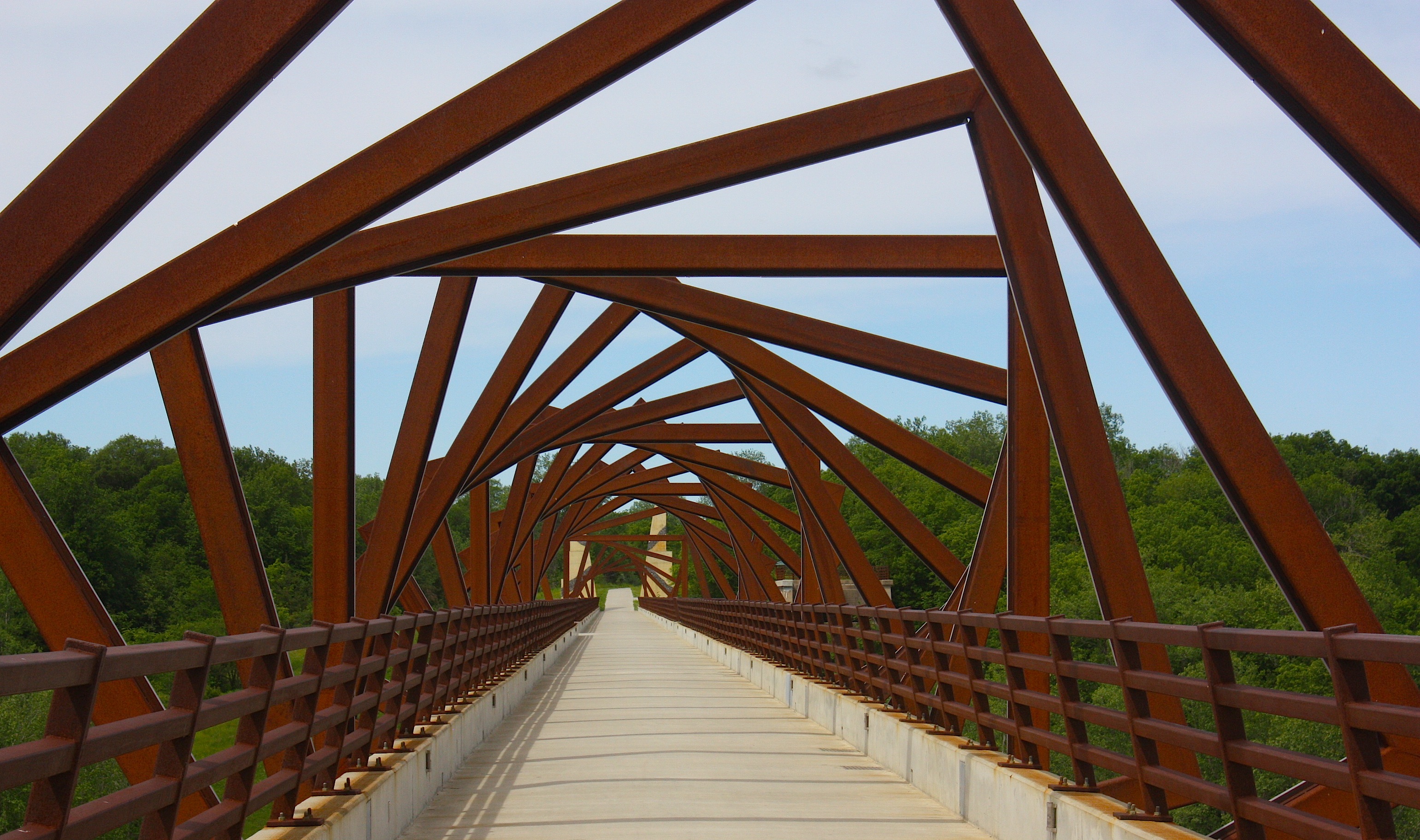 From Ledges I traveled south to Madrid to walk on a section of the spectacular High Trestle Trail. It was a cool morning and I expected to be overrun with bicyclists, but I had the trail and its namesake bridge pretty much to myself for more than a mile before a group of kids peddled by. Completed in 2011, the 25-mile High Trestle Trail runs from Ankeny to Woodward, and the half-mile, 13-story bridge is the highlight.