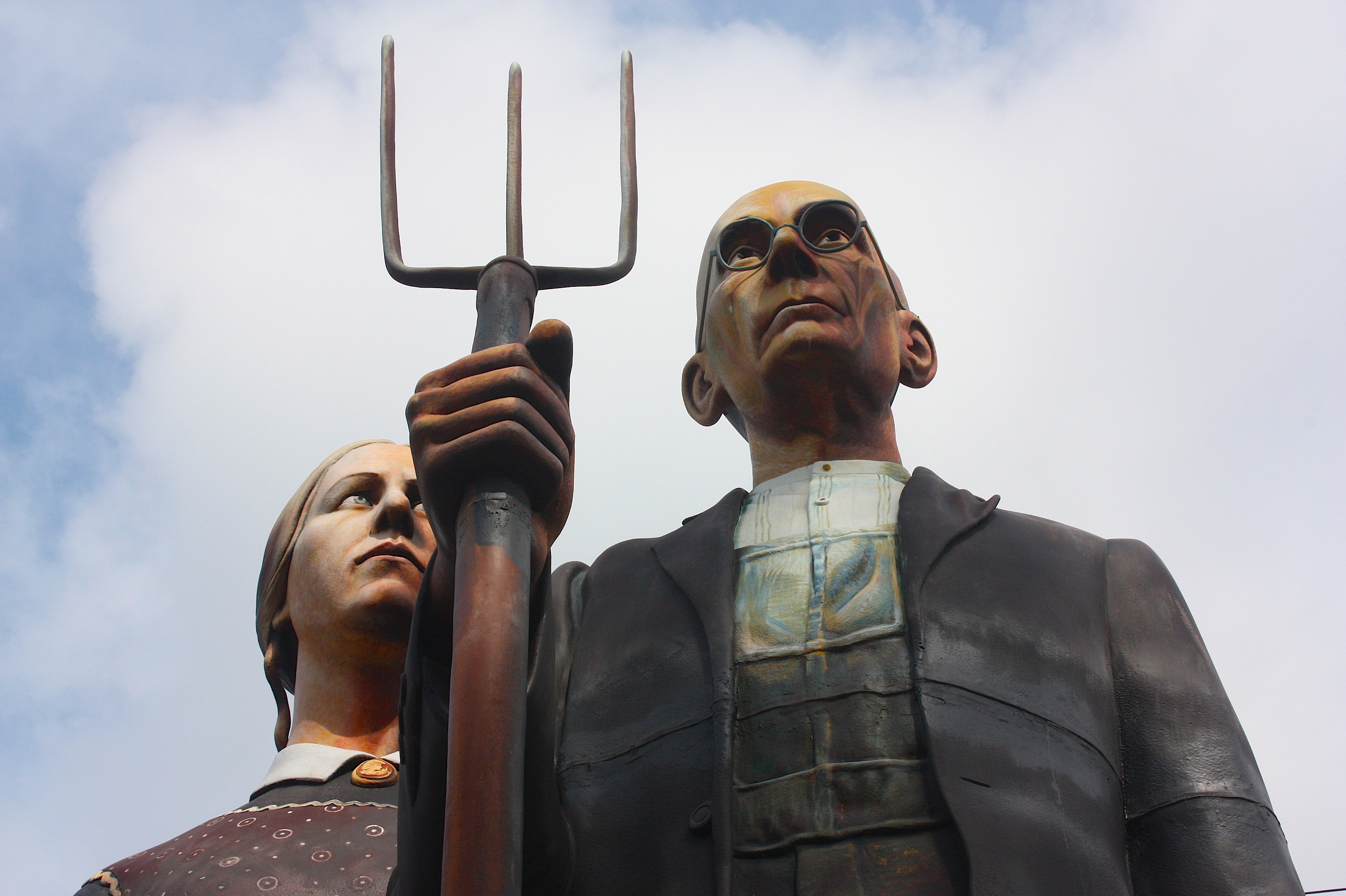 Here’s what I like about the fair: I like the vegetable-growing contests. I enjoy reading about the cooking competitions (but think some of the contestants are freakishly out of control). I like the cultural building with its art and photography exhibits. This year I really loved seeing (for the fourth time) Seward Johnson’s gigantic “God Bless America” sculpture (above) modeled after Grant Wood’s “American Gothic” – looking like it truly belonged on the Iowa State Fair grounds. I like the poultry barn, which also houses rabbits, and I like some of the frozen desserts that you can get only at the fair. I’ve never tried a deep-fried frozen Twinkie or Snickers candy bar on a stick because that stuff doesn’t really appeal to me, but I do like the chocolate- and nut-covered ice cream goodies. For the second time in my life I ate a Bauder’s peppermint bar, a wonderful concoction of peppermint ice cream sandwiched between smashed-up Oreo cookies and fudgie topping. Whoa. (That’s me below with my peppermint bar and Dave’s strawberry milkshake.)