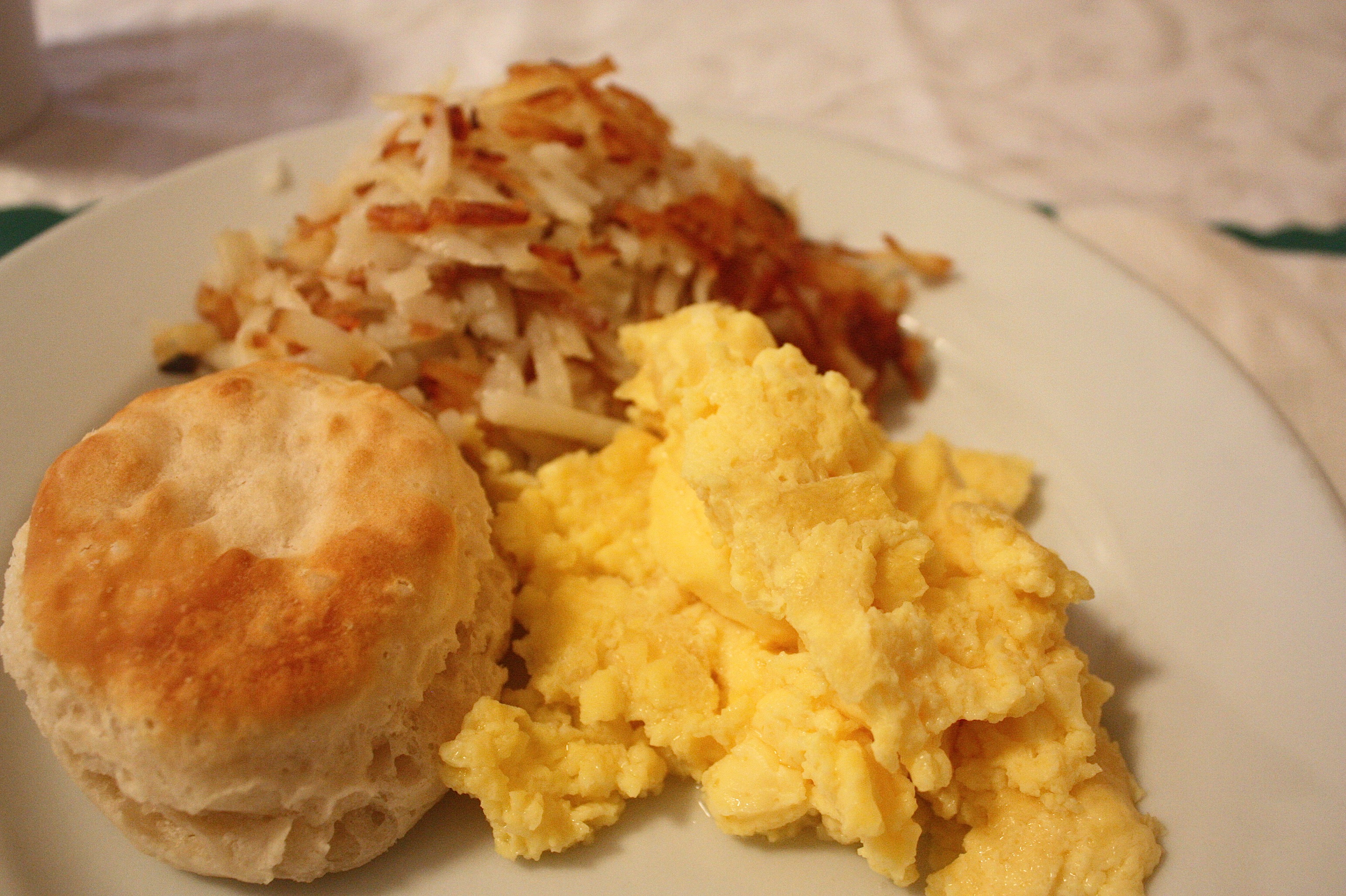 The next morning hotel guests were expected to go through the free hot breakfast buffet between 8 and 8:30 a.m. After that, the restaurant would be switching over to a large Sunday brunch. I was fine with that, because I wanted to get on the road. Breakfast consisted of biscuits (with gravy, if you like that sort of thing), buttery scrambled eggs, hashbrowns, and a few other items that I didn’t try. The basics were very good indeed. And a server brought around coffee.