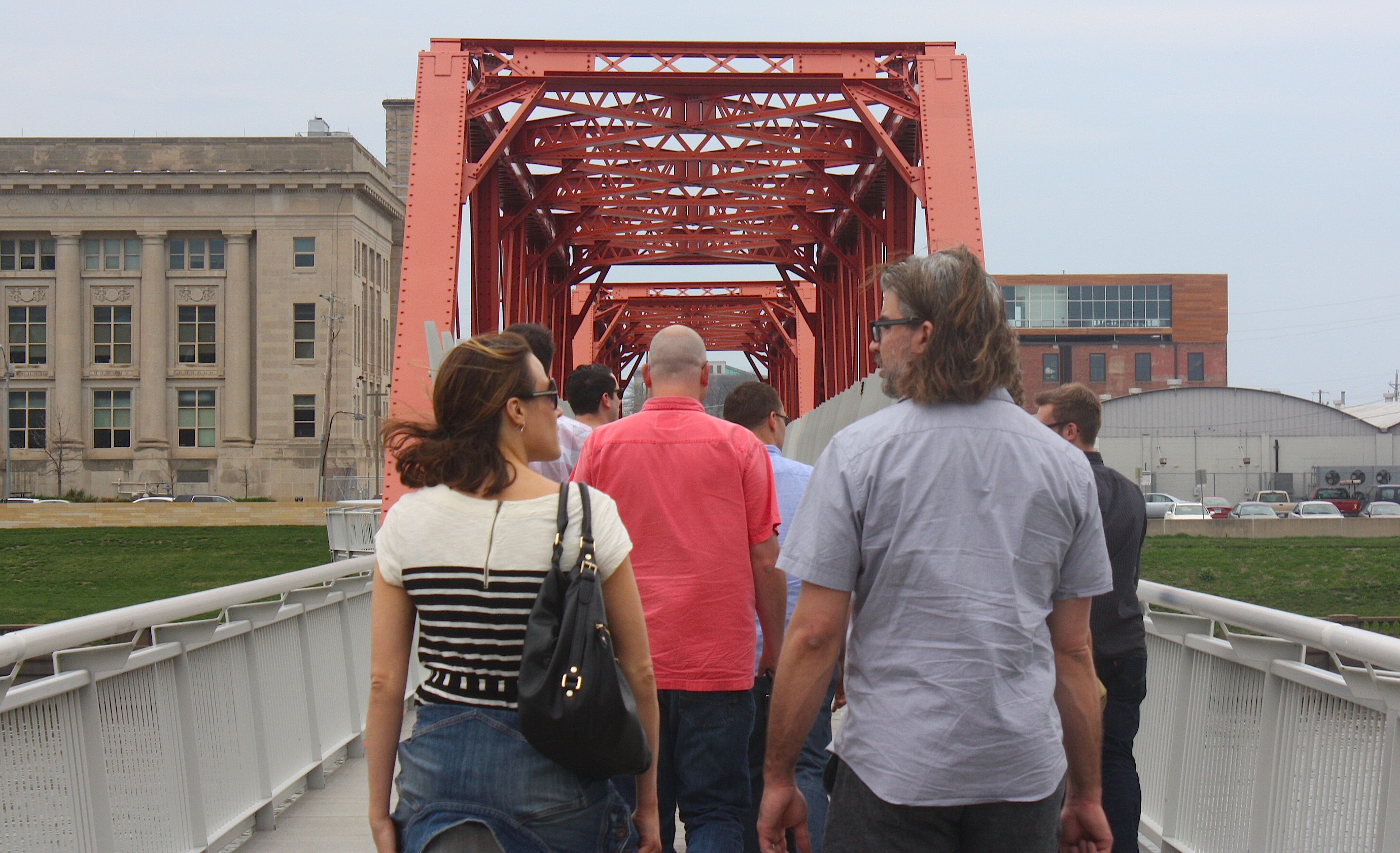 After our food and drink and friendly chatter, we headed back out, through the streets of the East Village, and across the Locust Street Bridge, with more views of City Hall and the World Food Prize building and some discussion of the recently shuttered Downtown YMCA building. We also got an opportunity to touch the exterior walls of the Civic Center, but I’m not sure why.