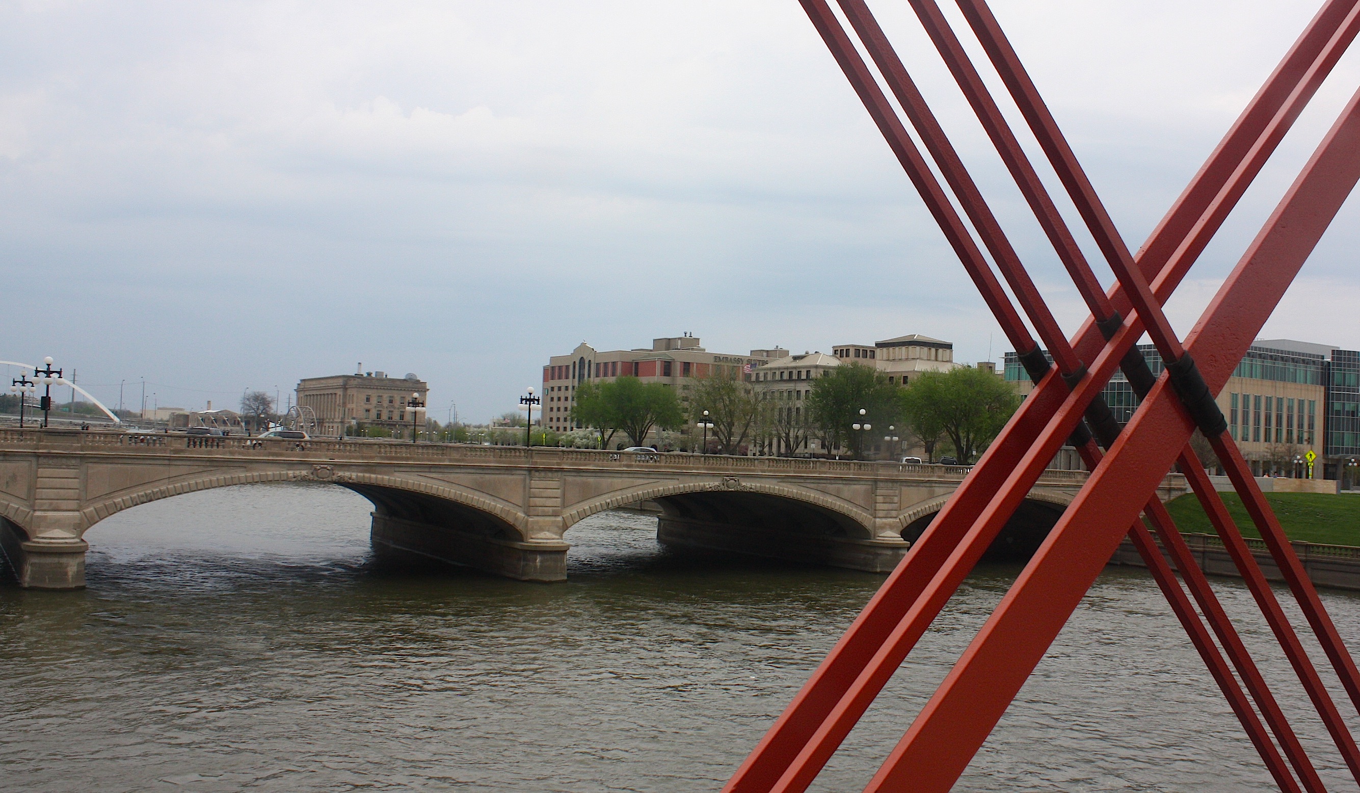 In addition to the historic buildings, from our mid-river vantage point we can also see examples of modern architecture, specifically the Embassy Suites Hotel and the Principal Riverwalk initiative. We can also see the glorious new Iowa Women of Achievement Bridge.