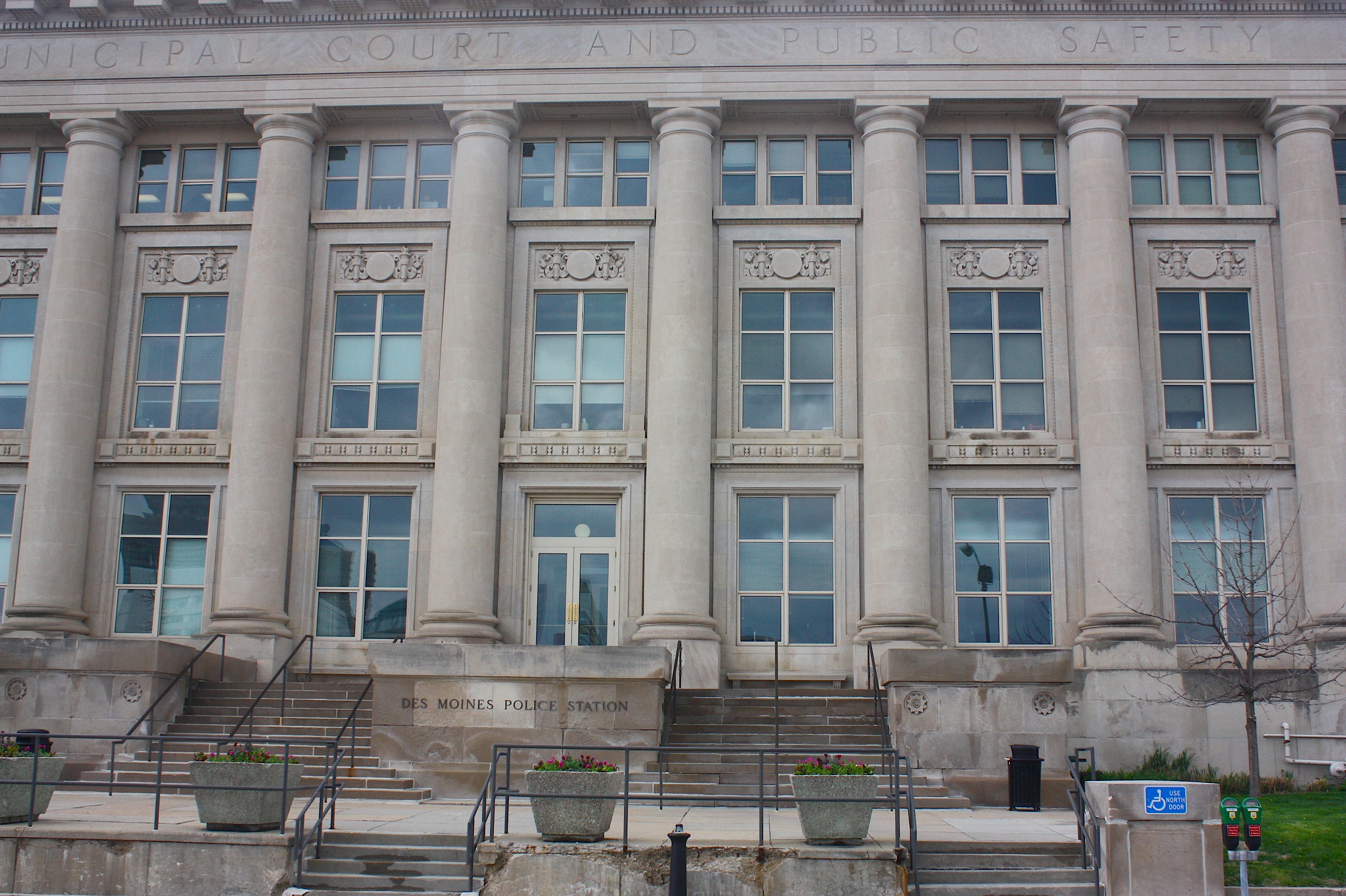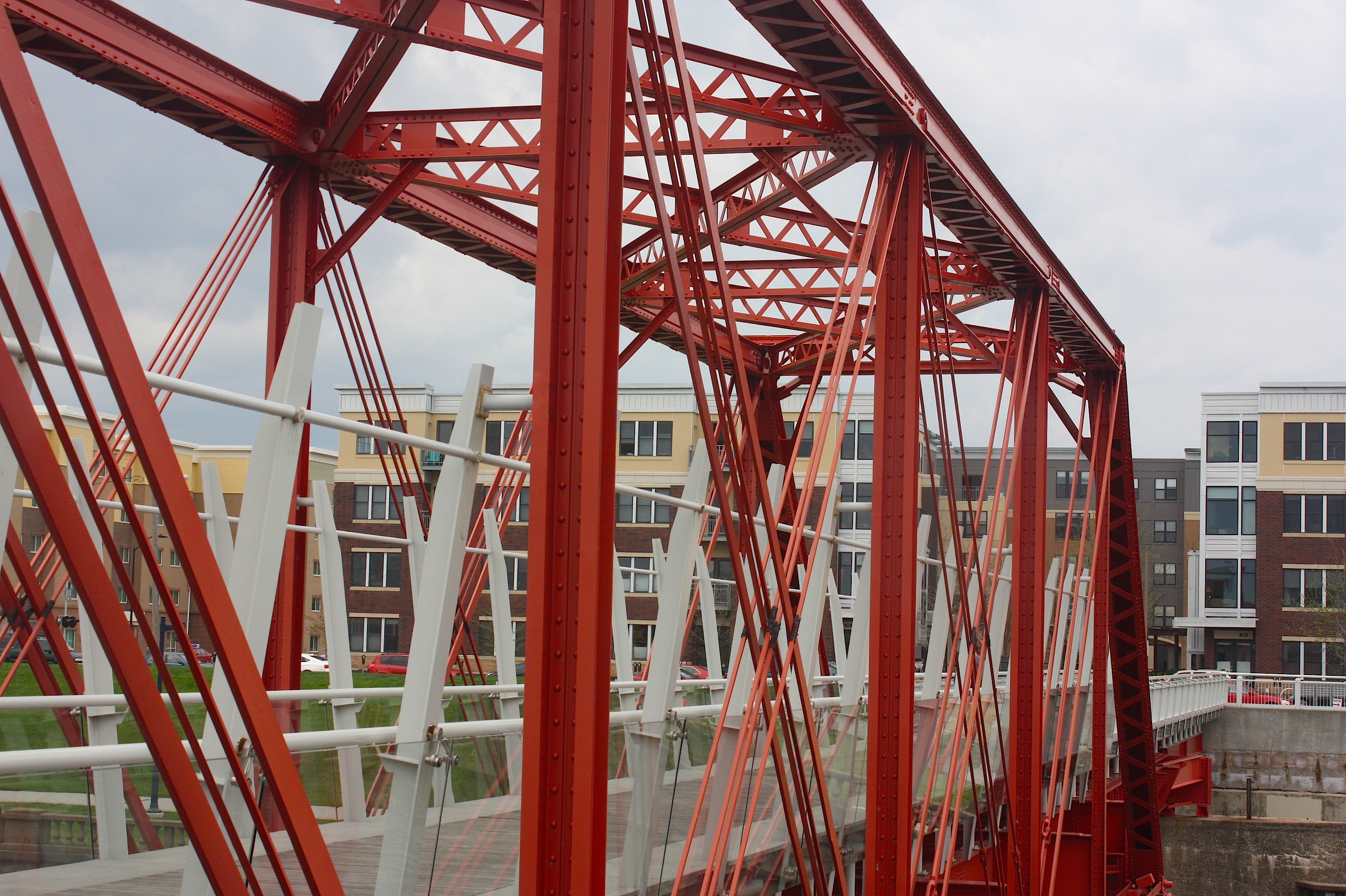 From here our group of about 20 people set off on our walk. We headed north and east and walked across the Des Moines River on the Red Bridge, a pedestrian bridge that was once a railroad bridge. We stopped on the bridge and took in the historic architectural sights on both sides of the river: The Polk County Courthouse Annex, the old Des Moines Library building that now houses the World Food Prize, City Hall, the Federal Courthouse and police station.