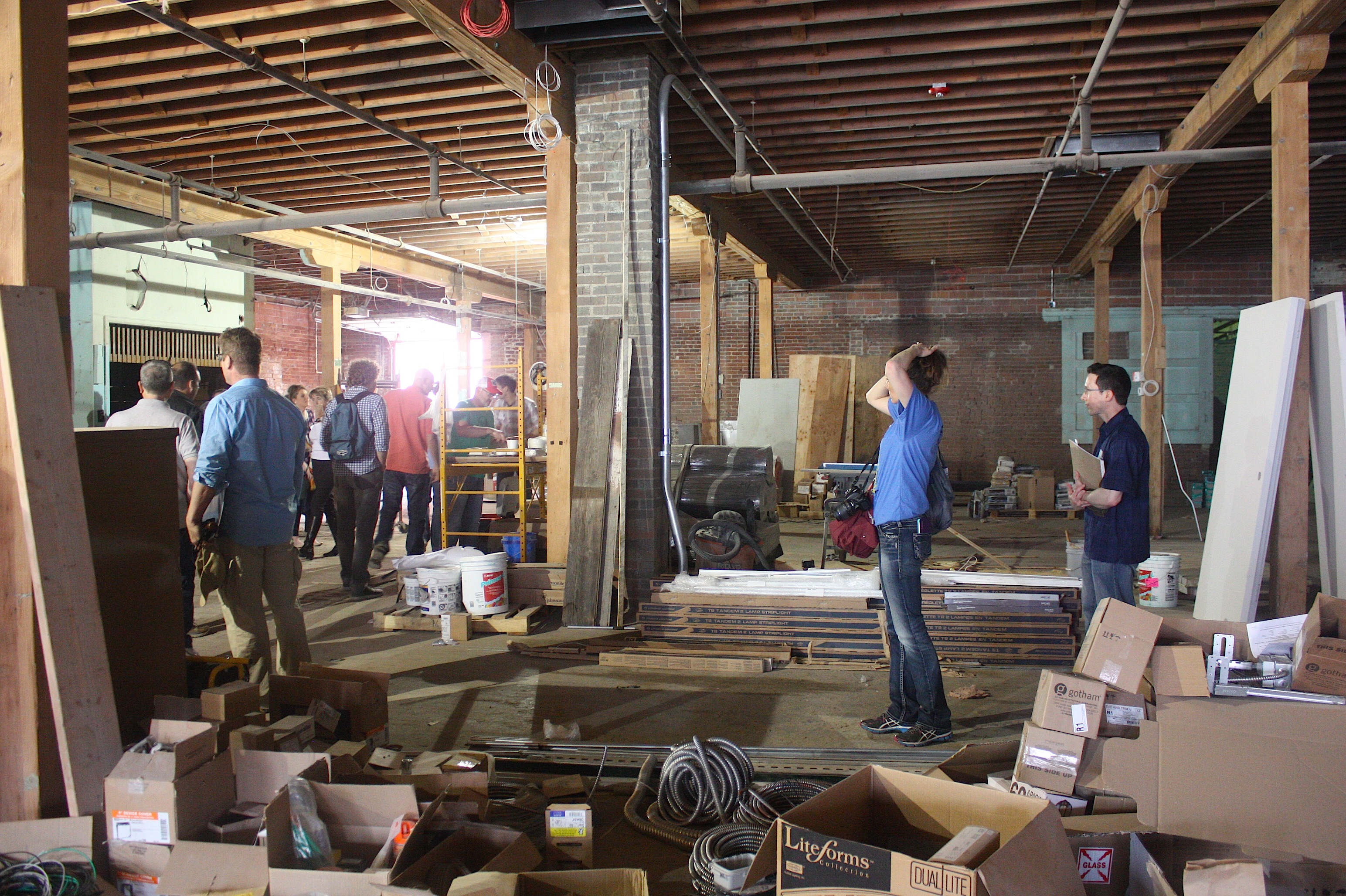 From here we took a sort of meandering walk through parking lots and alleyways to a building under construction in the 200 block of East Third. Known as the Dilley Building, the large brick structure built in 1907 was most recently the location of City Plumbing Supply. Soon it will be the home of The Iowan, another bar/restaurant in the Full Court Press stable. (It should be noted that the good folks at Full Court Press donated all the food and drink for this Iowa Architectural Foundation fundraiser.)