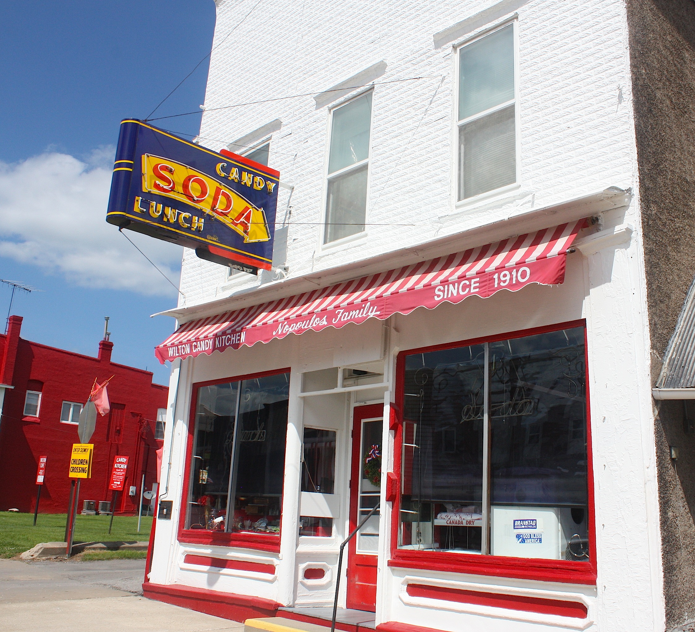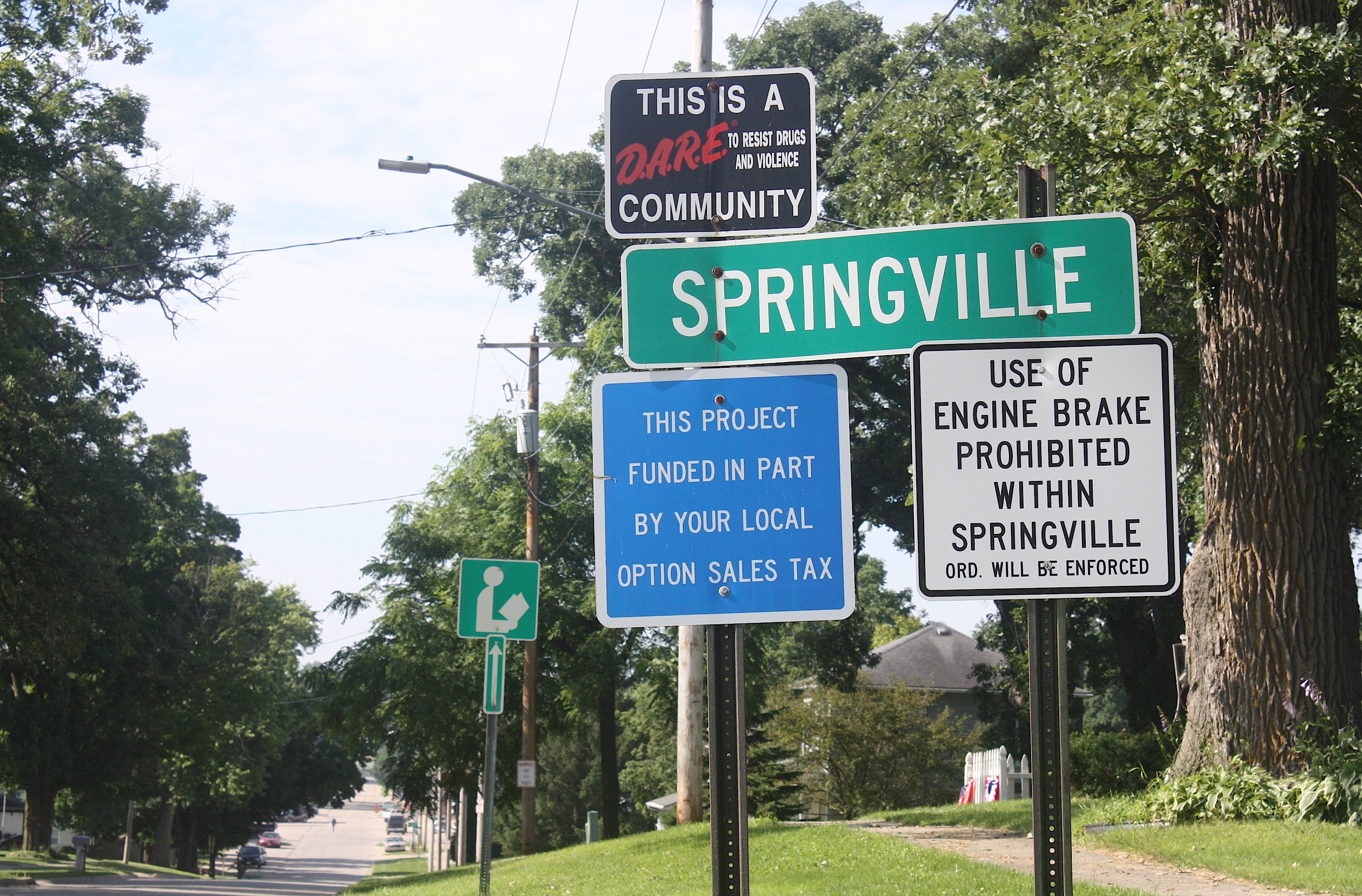 County Road X20 takes us to our next stop: Springville (population 1,074). We chuckle as we drive down the main street, with its American flags and welcome banners juxtaposed against the largest, most colorful NO PARKING sign I’ve ever seen, painted on the side of one of the town’s historic buildings. Well, OK then.