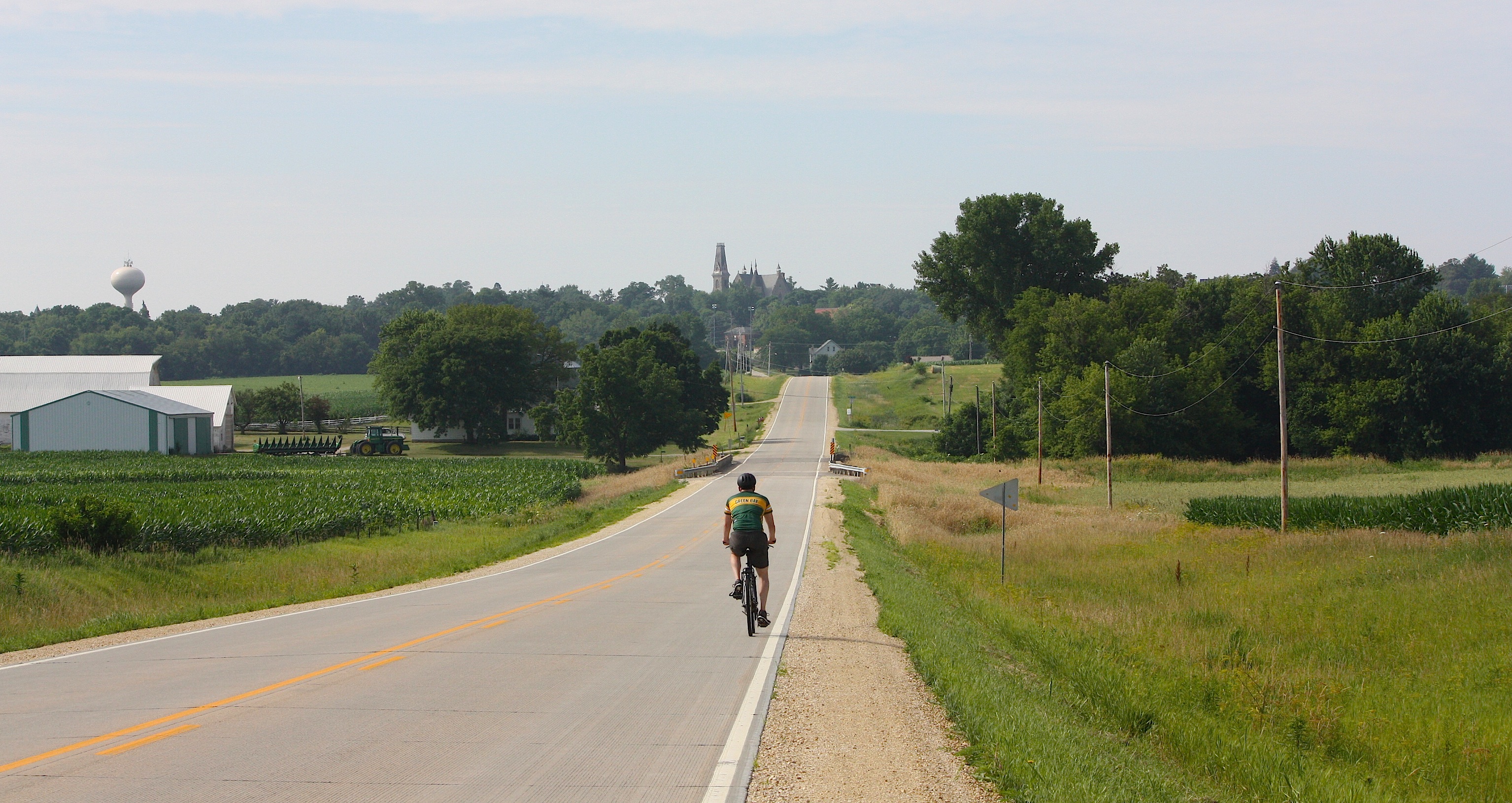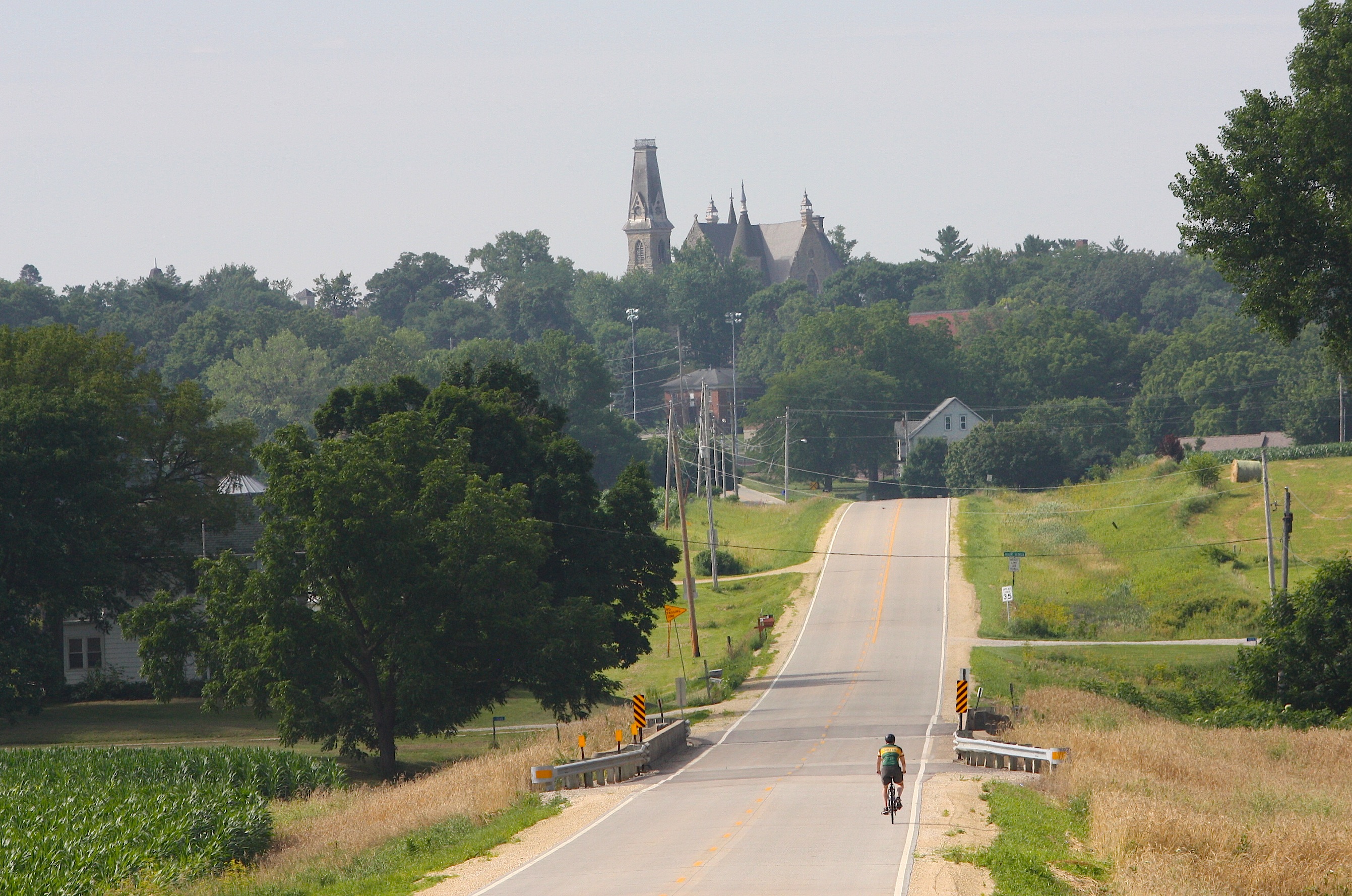 We take the gently rolling farmland out of Springville. There’s a pretty approach to our next stop: Mt. Vernon, and while we’re enjoying the view, a bicyclist rides by.