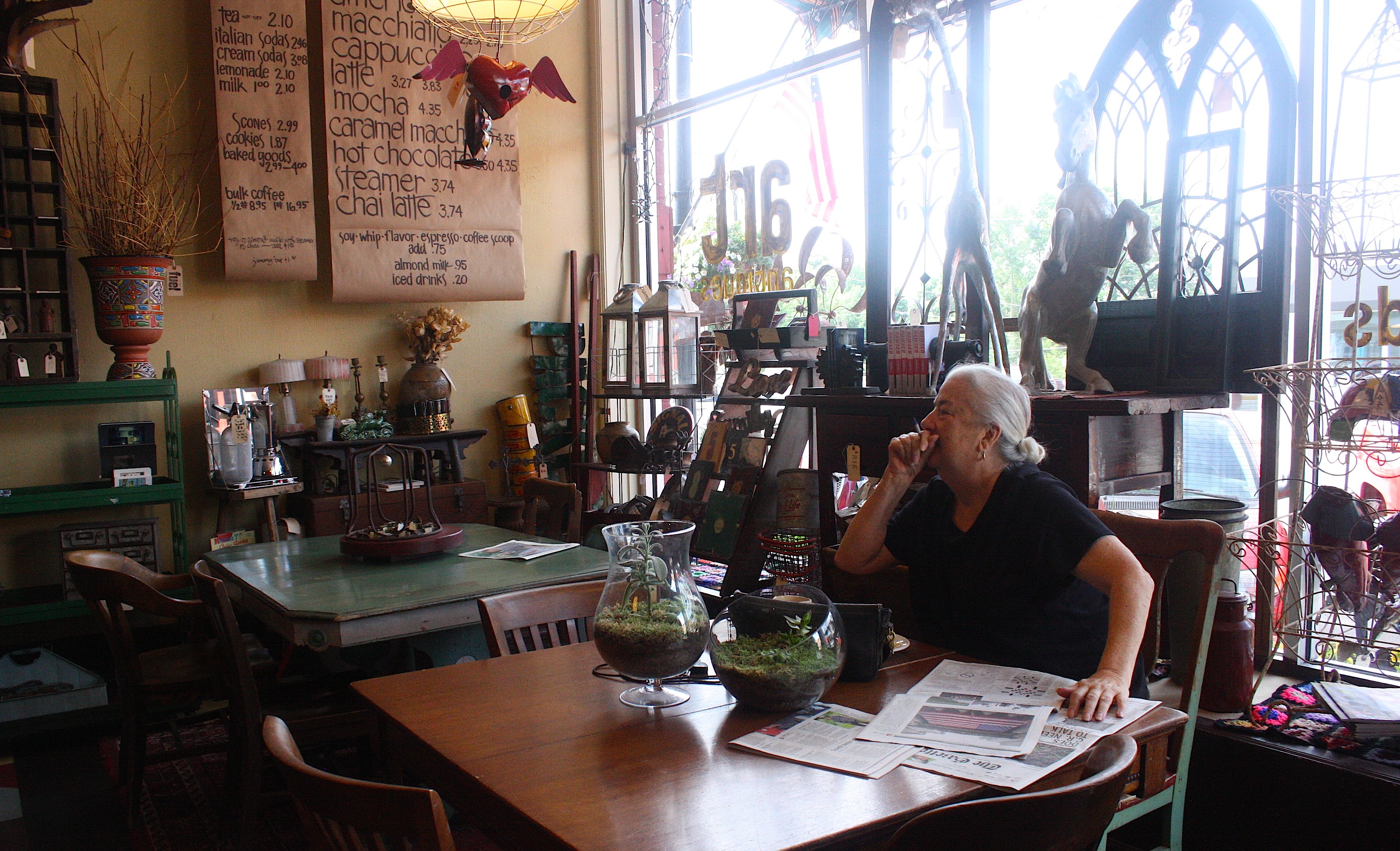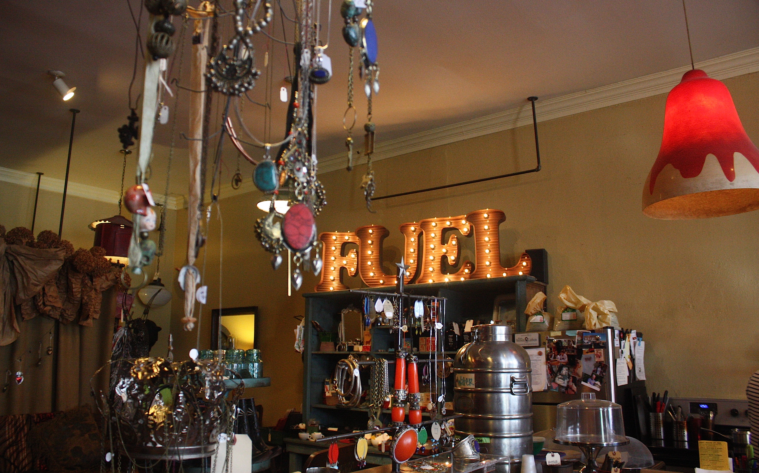 I’ve visited this town several times; in fact, I posted a blog about it in 2011. I loved the old Lincoln Café, and I was eager to try out its replacement, Palisades Café. But it wasn’t open for lunch yet. So we wandered through downtown, with its shops, antiques stores, services and restaurants. Still hungry after the kolaches, we stepped into Fuel, a shop that advertises “espresso and mom’s baked goods from scratch.” It was all that and more: an adorable coffee shop with antiques, vintage finds, and funky jewelry for sale. The two women behind the counter were friendly and welcoming; they offered to warm up Jim’s cheddar scone for him (he said it was delicious).
