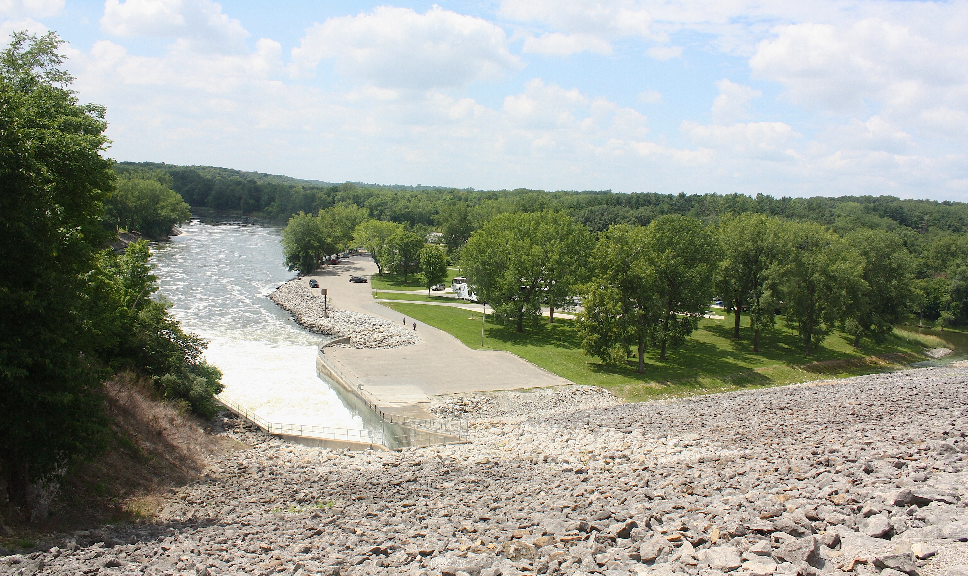 We backtrack. We drive by a fossil gorge, campgrounds, and other recreational areas. We drive over the Coralville Lake Dam (above). We end up in Iowa City, which is also wrong. The Register’s easy-to-follow route map is not exactly cutting it today, and we’ve left the detailed map back in Ankeny.