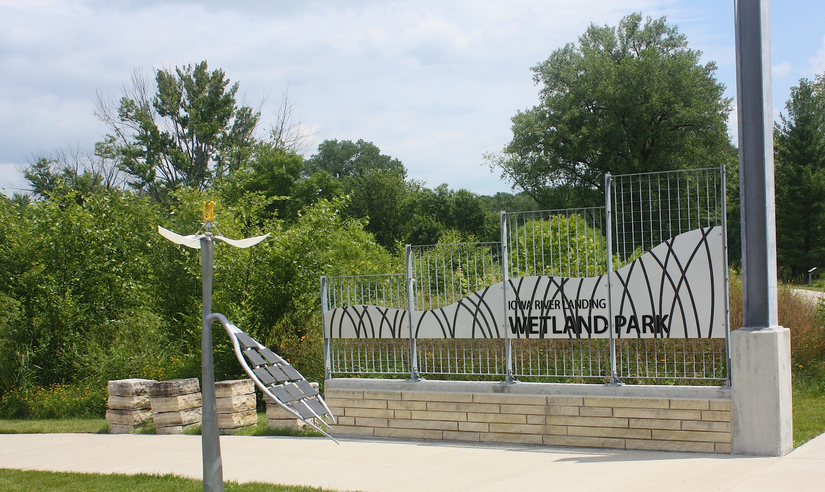 Iowa River Landing is mostly a giant Marriott Hotel and conference center. There are some shops, restaurants, and brewpubs. It looks newly developed and very suburban. We walk a wetlands trail, which is nice but sort of weird because of its location, and spot a few sculptures along the sculpture walk. We still can’t figure out where people are going to camp, and we’re not sure how they will travel from Coralville to Iowa City, which is basically one big sprawling city.