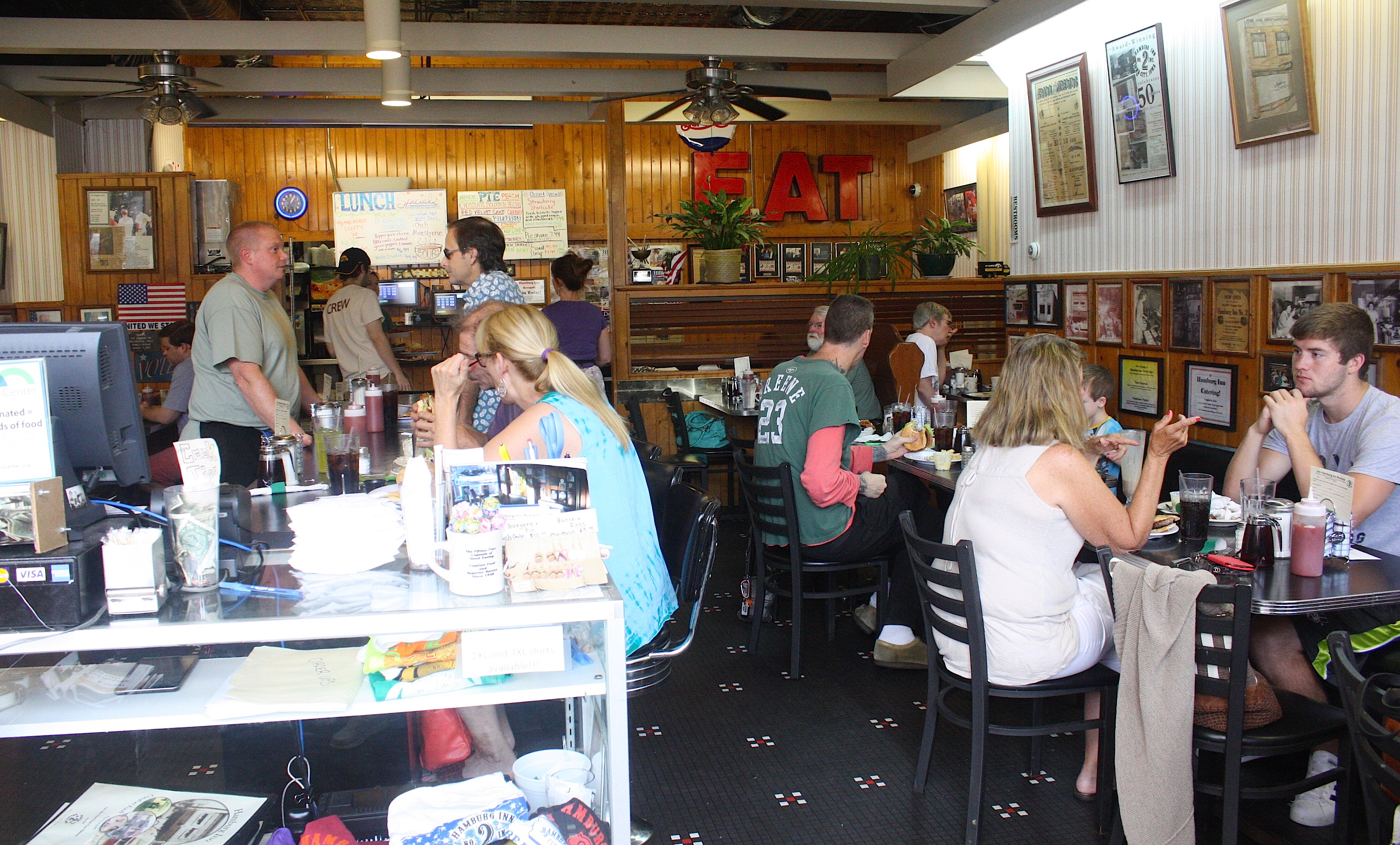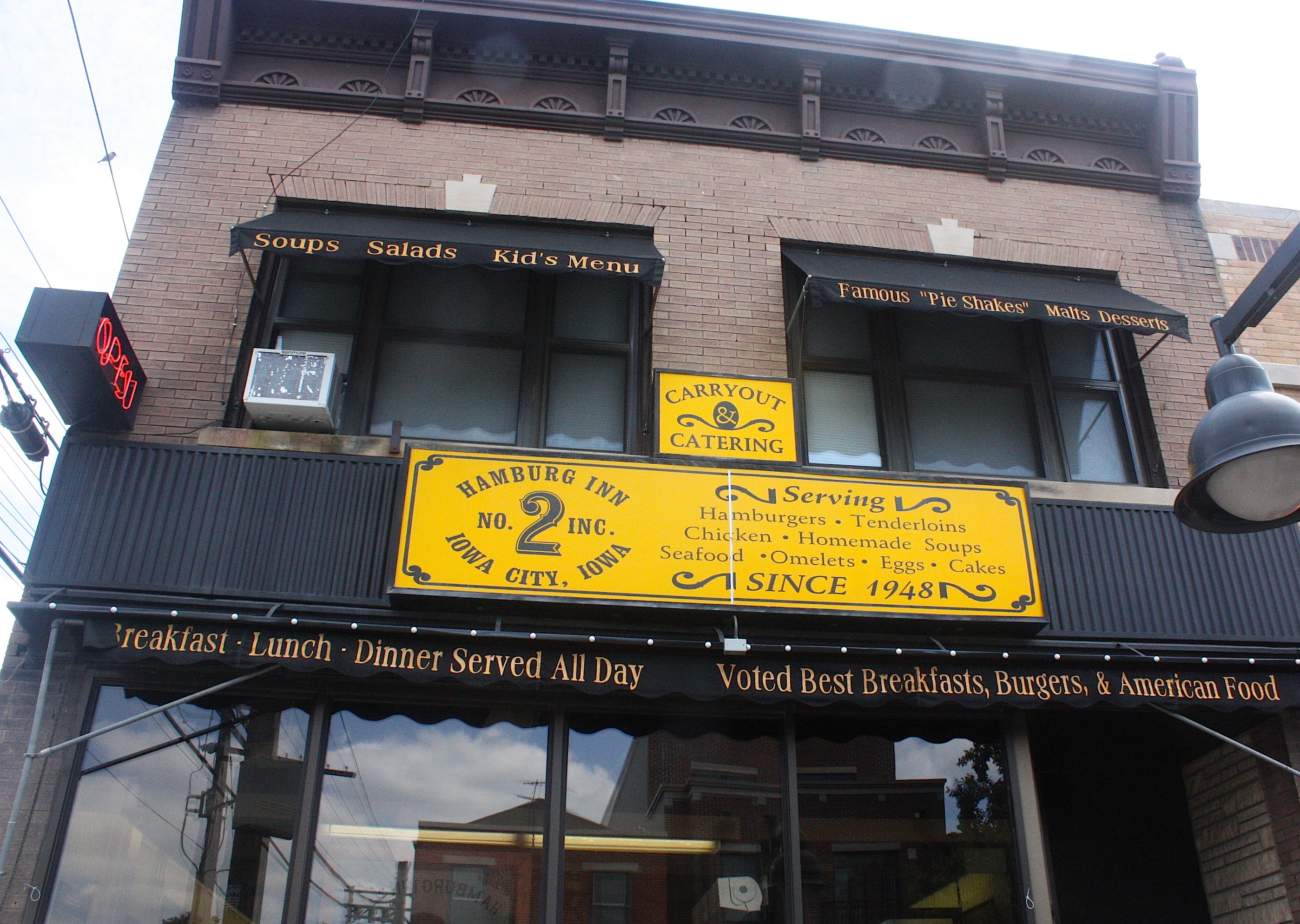 But now here we are in Iowa City, with its bustling downtown, University of Iowa campus, cyclists, pedestrians, and gangs of small children all dressed alike. There’s so much to do here, but so little time. But we’re hungry, so we stop at one of the Register’s suggested stops: the Hamburg Inn No. 2.