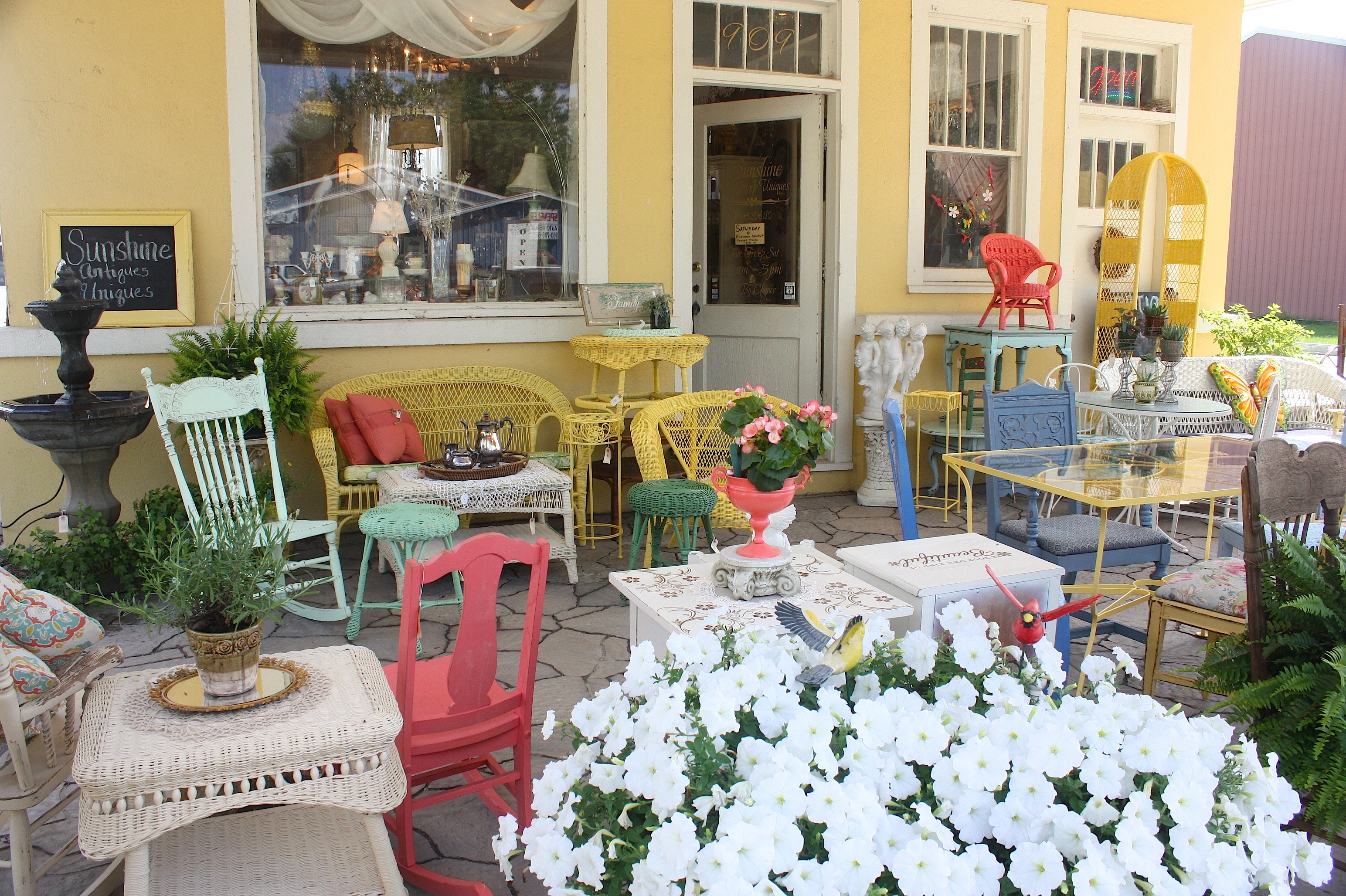 Next on the route is Durant (population 1,832), home to Durant Iron & Metal. There doesn’t appear to be much here…until we start to head out of town and spot Sunshine Antiques & Uniques, an adorable shop in a 1930s Texaco gas station, with painted patio furniture, tables, and other goodies outside. Inside, it’s very girlie and sweet.