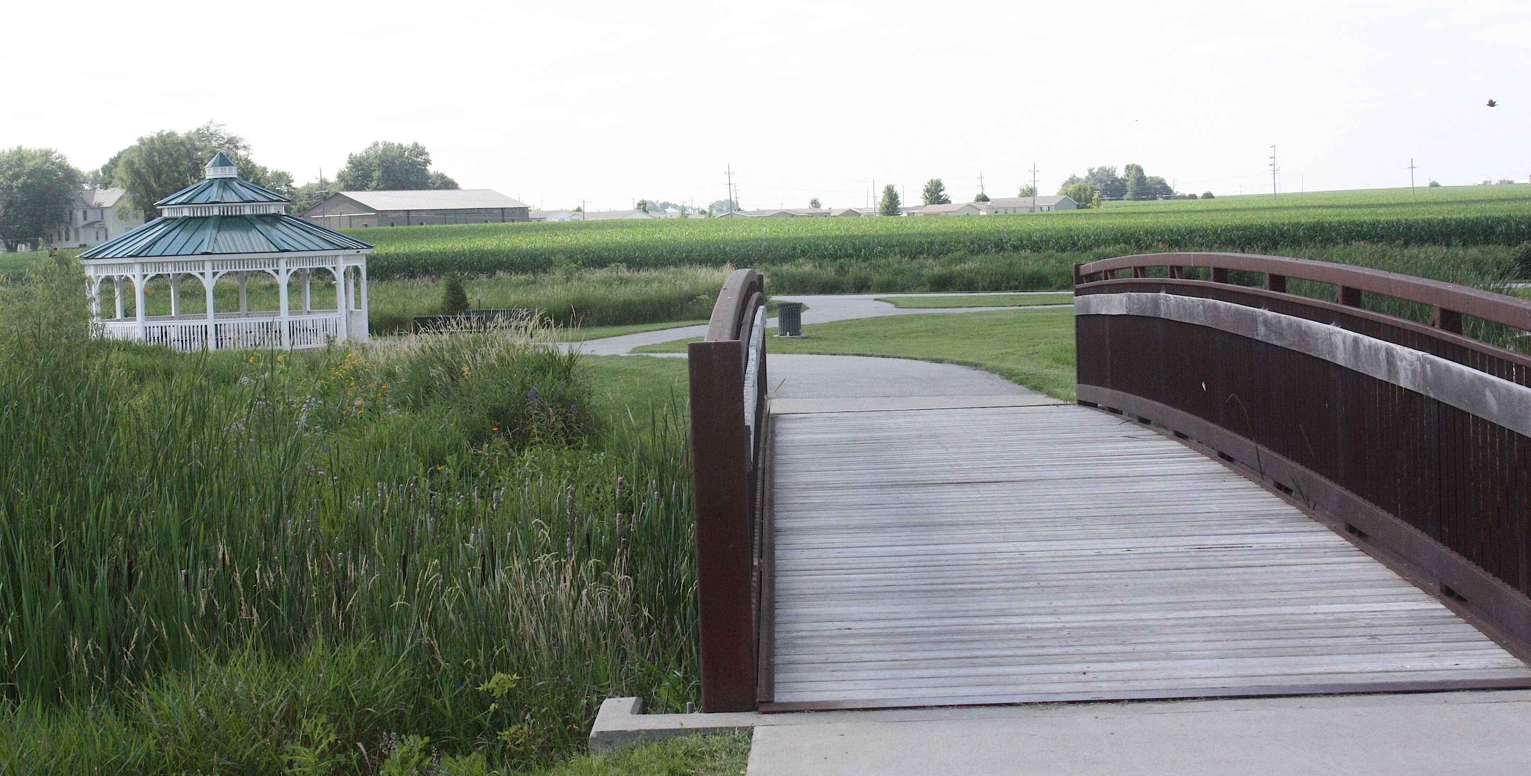 I meet Jim in Ankeny and we head for the start of the bikers’ Day 6 route: Hiawatha (overnight town theme: “Throwback Thursday.”) It’s nearly 8:30 when we get there. I visit Hiawatha at least once a year because I do business with Cedar Graphics, a local printer. So I know the welcome sign is a cute one: “HIawatha!” it says cheerfully. We take Boyson Road to Guthridge Park, a huge green space where cyclists will camp for the night. Hiawatha (population 7,024) is a relatively small suburb of Cedar Rapids. We don’t find much there besides homes, chain stores, and light industry.