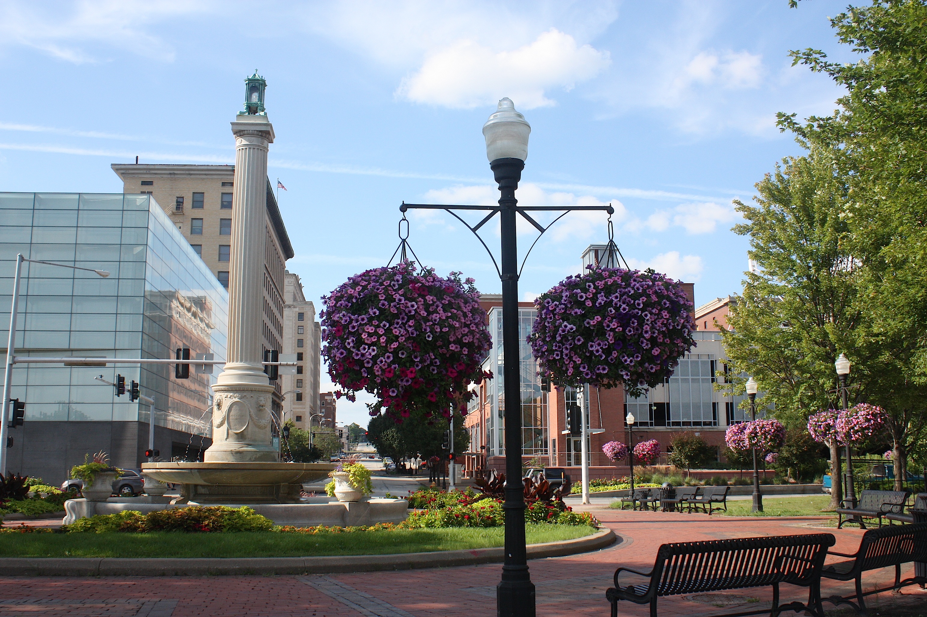 At 4:45, we roll into Davenport. Our route takes us by some spectacular old architecture, including the lovely St. Ambrose College campus. Our destination is the riverfront, with its sky bridge, casino, green space, and bike path along the river. We go up the sky bridge for a different view before driving north along the river, with a view of lovely historic homes on the bluff.