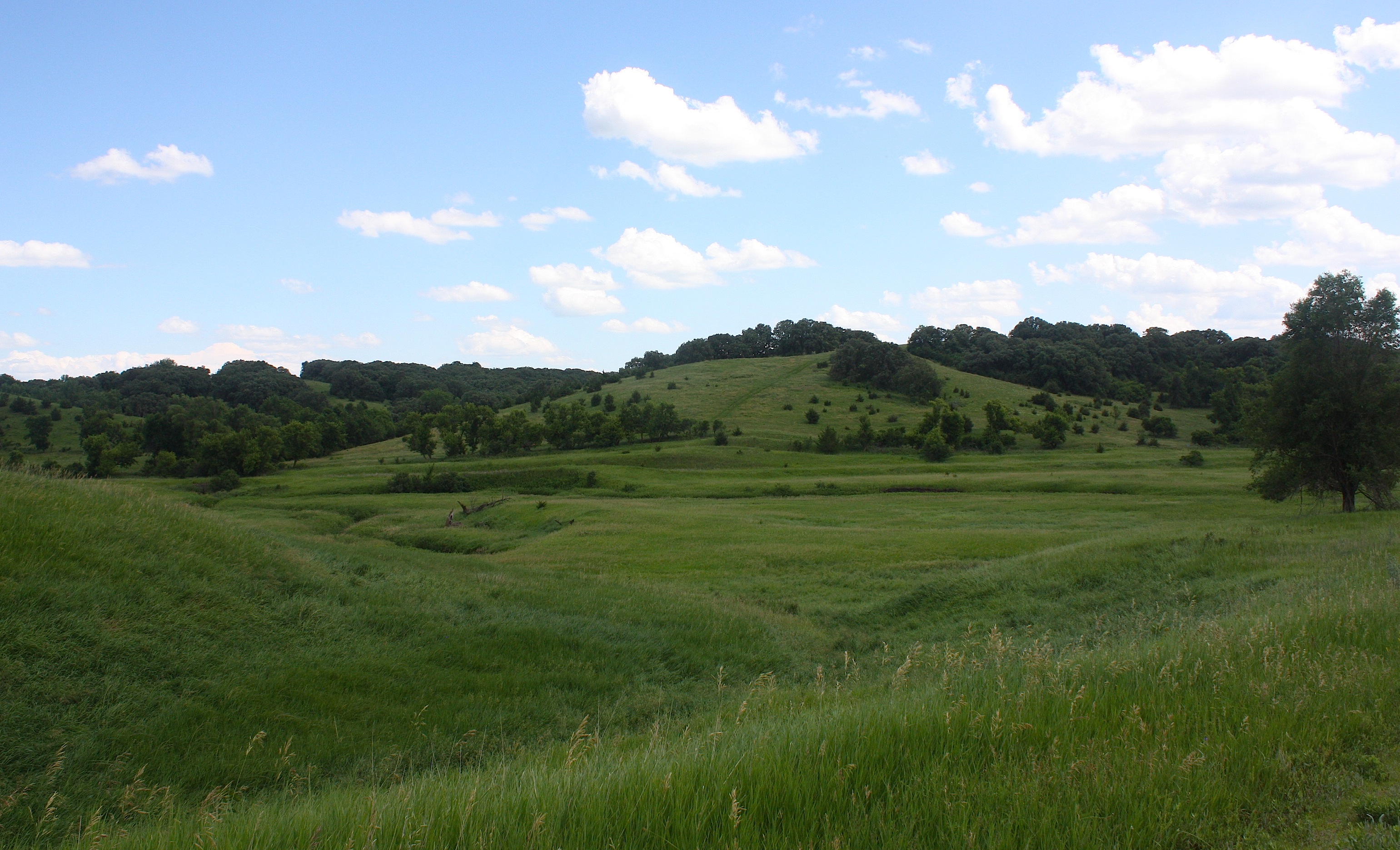 You can find Blood Run, a National Historic Landmark, at the far northwest corner of Iowa…if you’re willing to get off the main roads. Located about half a mile south of 1001 120th St., Larchwood, the Blood Run archaeological site is very remote and difficult to find. (The nearest city of any size is Sioux Falls, S.D.) The woman I spoke with at the Lyon County Conservation Board suggested setting my GPS at 1051 120th St., but it’s even south of that if I remember correctly.